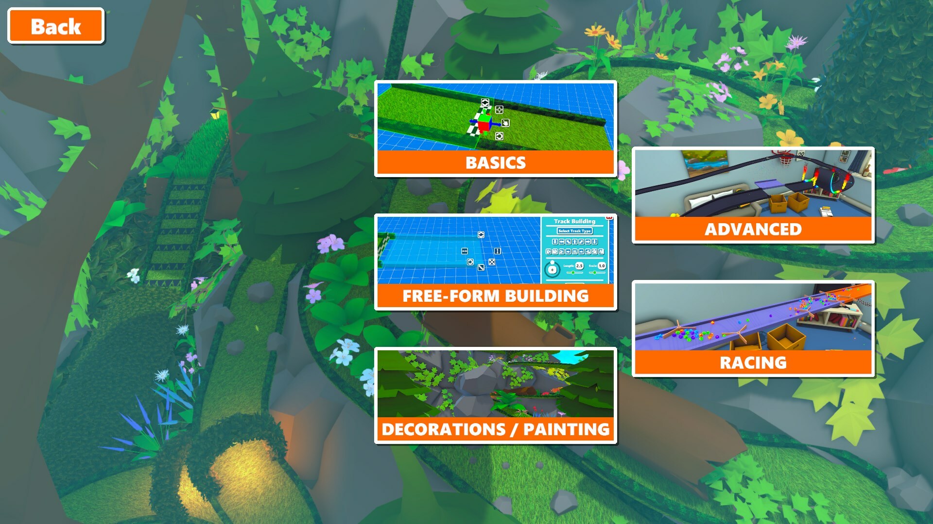 In the main menu you'll find a button which leads to the tutorial section. Every tutorial consists of some tasks that you need to do in order to complete the tutorial. The basics tutorial consists of the most tasks which covers every aspect you need to know in order to build a track and get some marbles rolling.