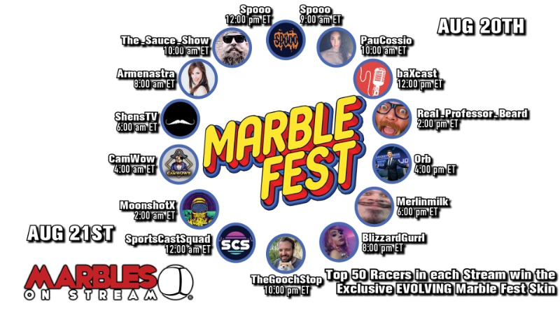 The next Marble Fest will be taking place on Saturday August 20th at 9am ET to Sunday August 21st at 12pm ET! This time join a list of streamers for 2-hour segments back to back to back... Each host will have 2 hours to run a Marbles on Stream event as they wish, at the end of 2 hours each streamer will award the Top 3 some PbP Coins and the Top 50 from each segment will win the Exclusive Marble Fest evolving marble. There are 6 levels in this events marble, each one you win (up to 4) will change the way it looks. Once one streamer ends the next streamer begins! Below is a list of streamers and their time slots:
