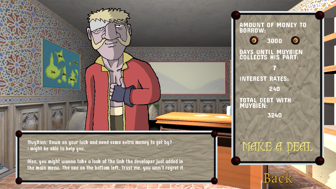 Second update: Haggling. You can take a gamble and, if you're lucky enough, the shop keeper will lower down prices for the day. The opposite can also happen, though, and you'll have to pay for higher prices if he decides so.