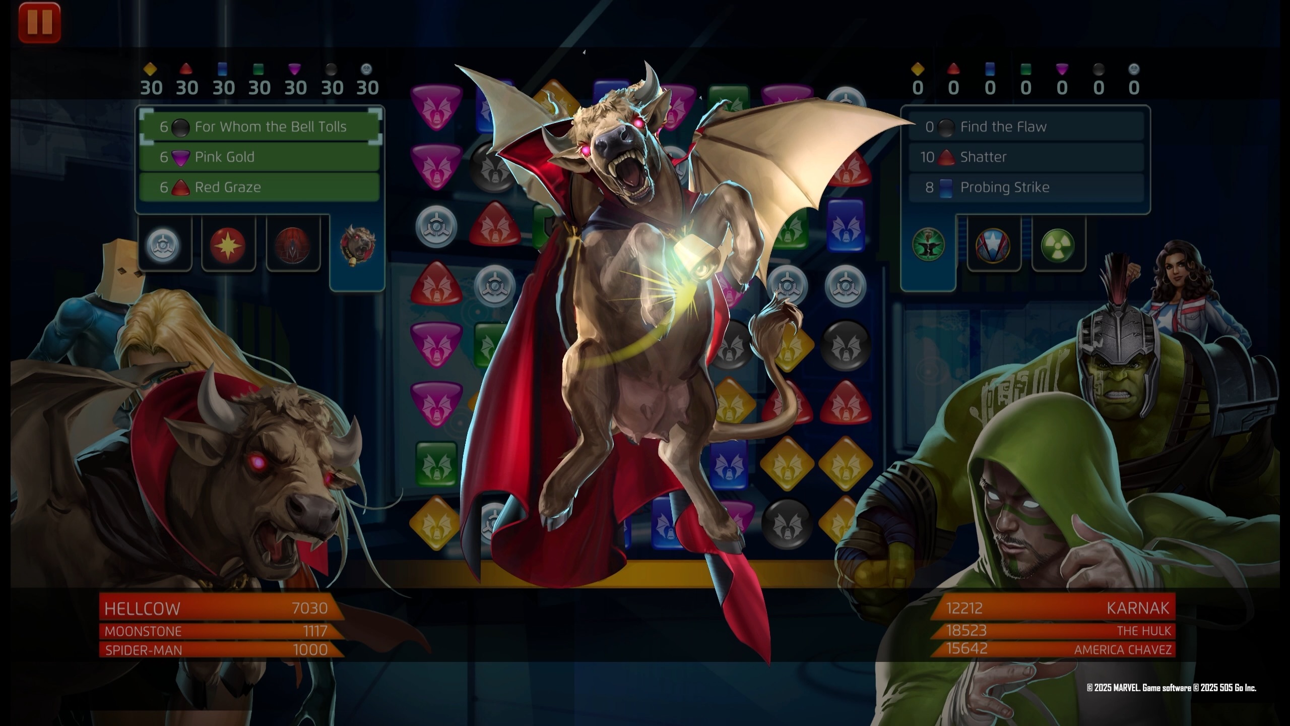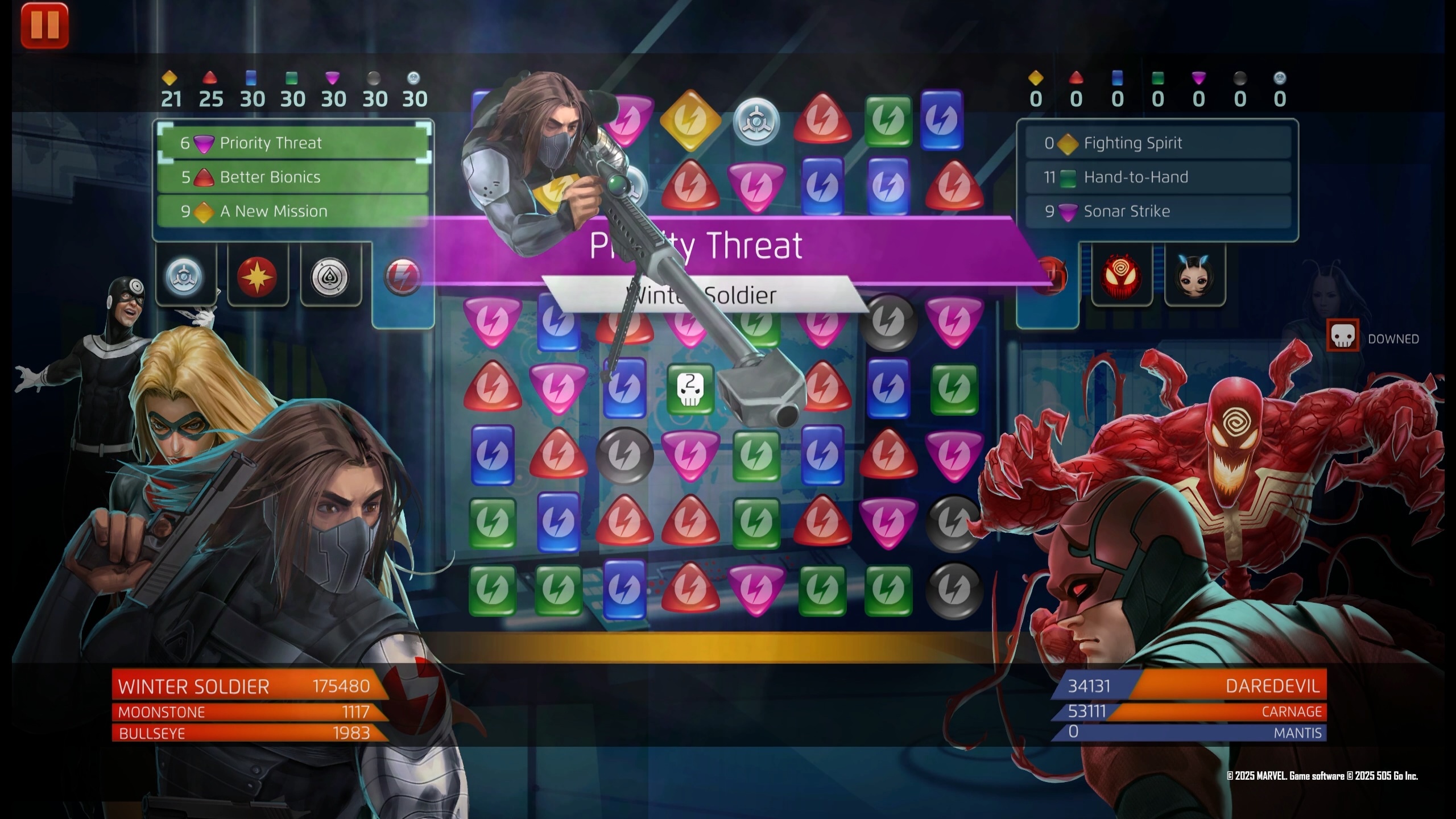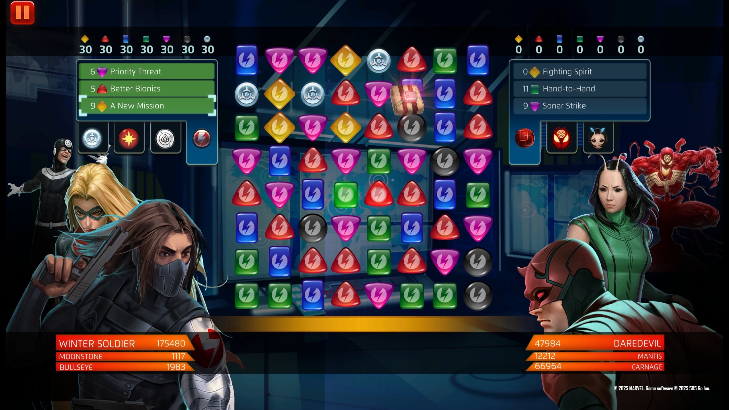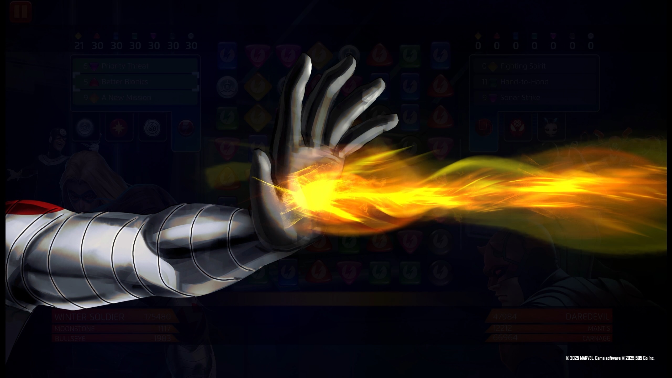 Taking Nick Fury’s place as ‘the Man on the Wall,’ Barnes recruits a new team of Thunderbolts to continue the fight against existential threats to the Earth. Select as many basic or enemy Strike, Attack, or Protect tiles as you have Thunderbolts on the team and convert them into 2-turn Countdown tiles. These tiles deal 1639 damage if converted from enemy Strike, Attack, and Protect tiles, otherwise they deal 3854 damage.
