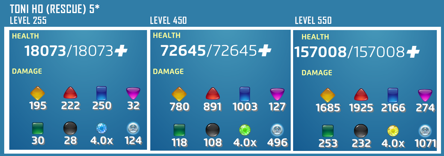 Level 5: Deal 1595 team damage. Deal an extra hit equal to 797. Deal 958 bonus match damage. 450: Deal 6410 team damage. Deal an extra hit equal to 3206. Deal 3847 bonus match damage. 550: Deal 13853 team damage. Deal an extra hit equal to 6926. Deal 8312 bonus match damage.
