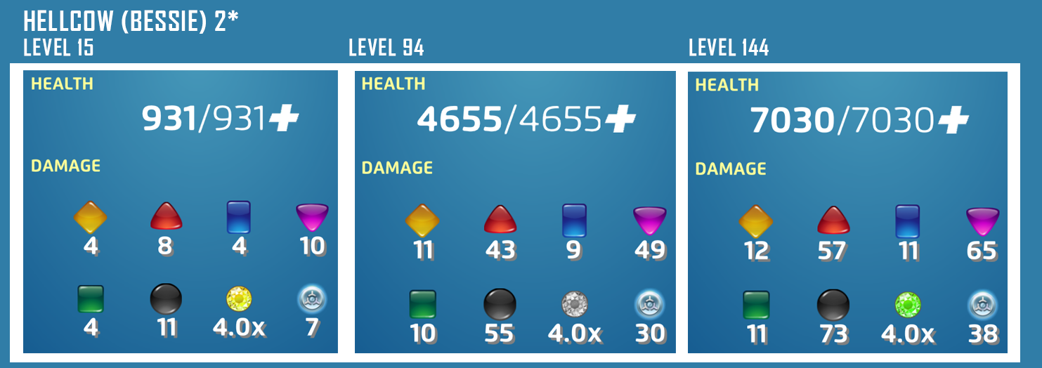 Deal 61 damage, plus 8 for each friendly Hell-milk Trap tile on the board and that allies have matched or destroyed this battle (max of 160 damage), then Hellcow heals for 30% of the damage dealt.