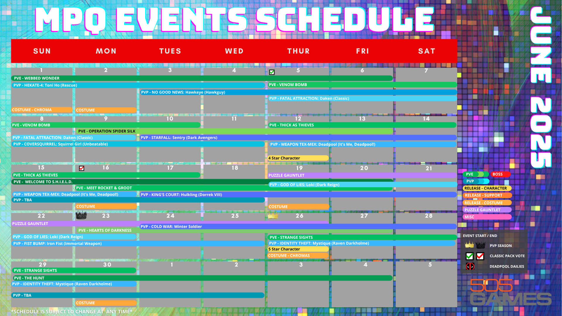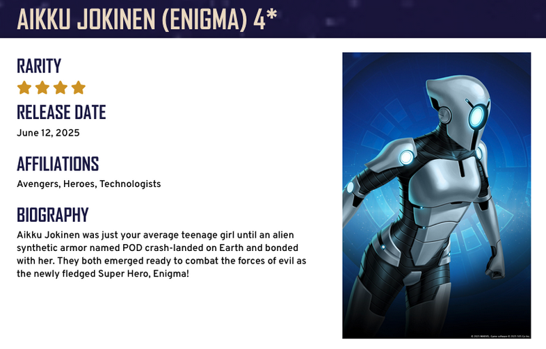 Thick as Thieves June 12, 2025, 04:00am – June 16, 2025, 11:00pm Aikku Jokinen (Enigma) Covers and Shards in Placement rewards, Event Token in Progression rewards Welcome to S.H.I.E.L.D. June 15, 2025, 04:00am – June 20, 2025, 11:00pm Aikku Jokinen (Enigma) Shards + Recruit Token for Shield Offer in Progression rewards Meet Rocket & Groot June 16, 2025, 04:00am – June 19, 2025, 11:00pm Aikku Jokinen (Enigma) Covers and Shards + Vault Token in Progression rewards