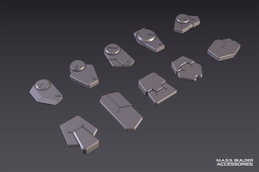 The accessory system is finally here! Let's recap what is it with what we've said months ago. Accessories are first conceptualized as a "3D decal system" where players can attach small parts onto armors and weapons, making a unique creation of their own, specializing them and fulfilling their imagination. Accessories will range from geometric shapes to complex parts, and you will be able to attach them to most surface of EVERY part itself.