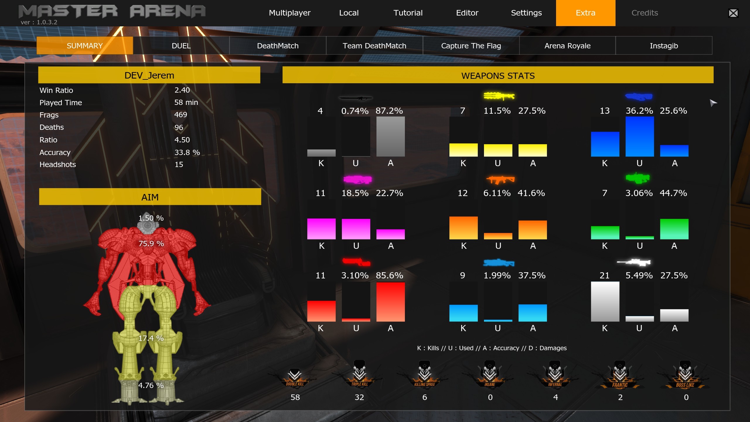 Arena Royale integrates a “Gun Master” mode: the player gets the weapons based on the number of frags and deaths :