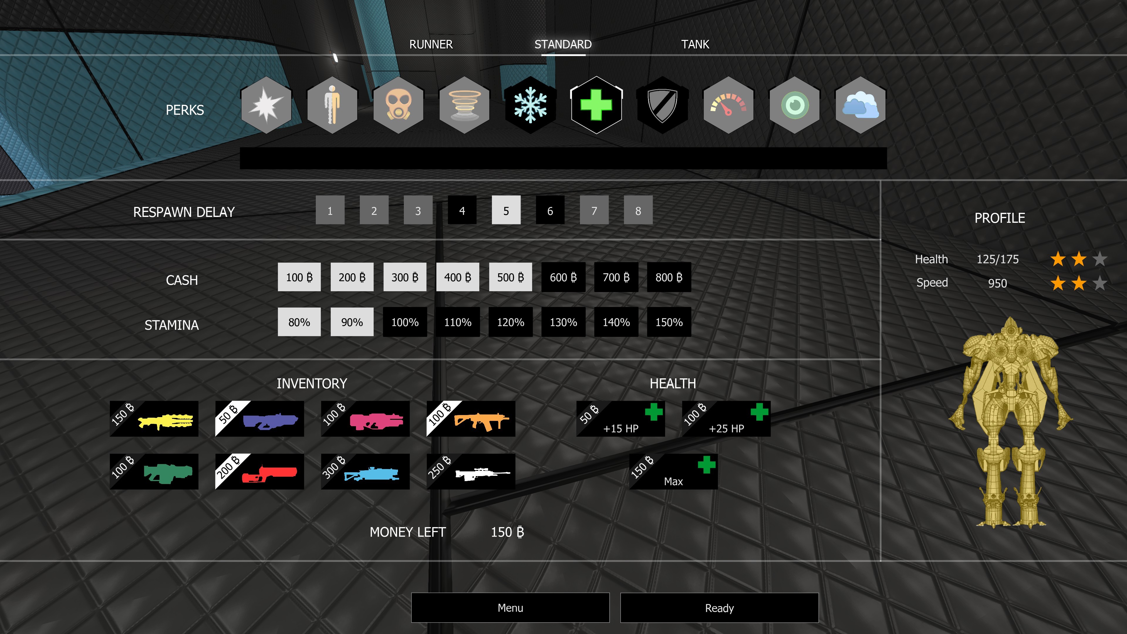 With the cash, you will be able to customize your inventory. Do you want a rocket launcher? OK guys, it will be 200₿. Would you like to respawn with more HP? Well, just make your choice.