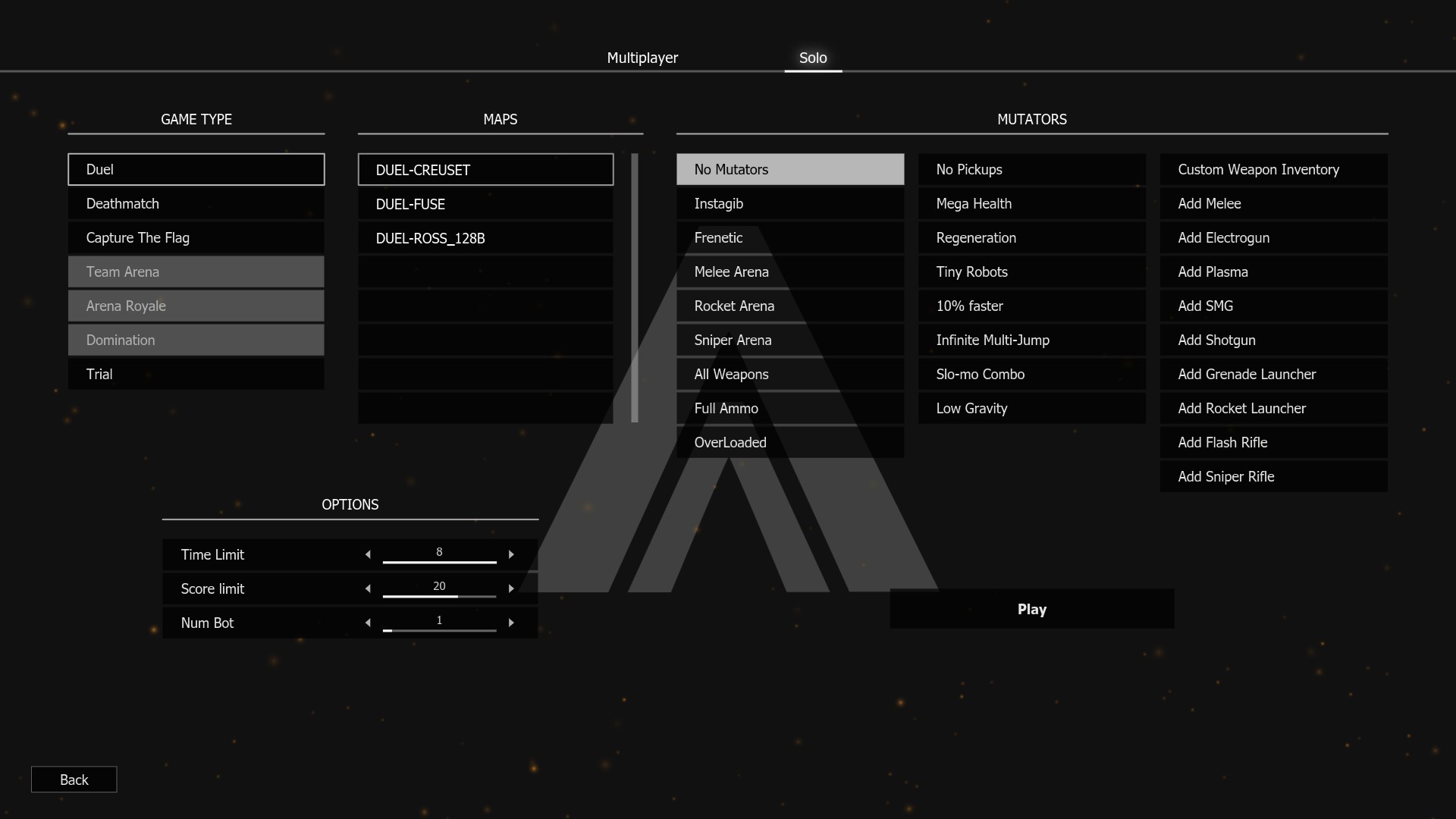 Solo: simplification of the choice of mutators (multi-selection easier) and more game modes available. Duel, Deathmatch and Trial games can currently be launched. As for the CTF mode, it is playable but bots are not ready so you will only be able to run around in the map. Other modes will be available later.