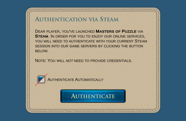 The integration between Steam and our PlayFab account has been completed and you will be able to authenticate with us by using your current Steam session. You will not be required to enter credentials or anything else since the authentication works on a different level. This is required in order for you to be able to enjoy the online features of the game as well as for the game itself to be able to manage your Masters of Puzzle profile, scores, and inventory. While you can still play offline in a more limited setup, we recommend that you authenticate once and let the game do that for you automatically in the future.