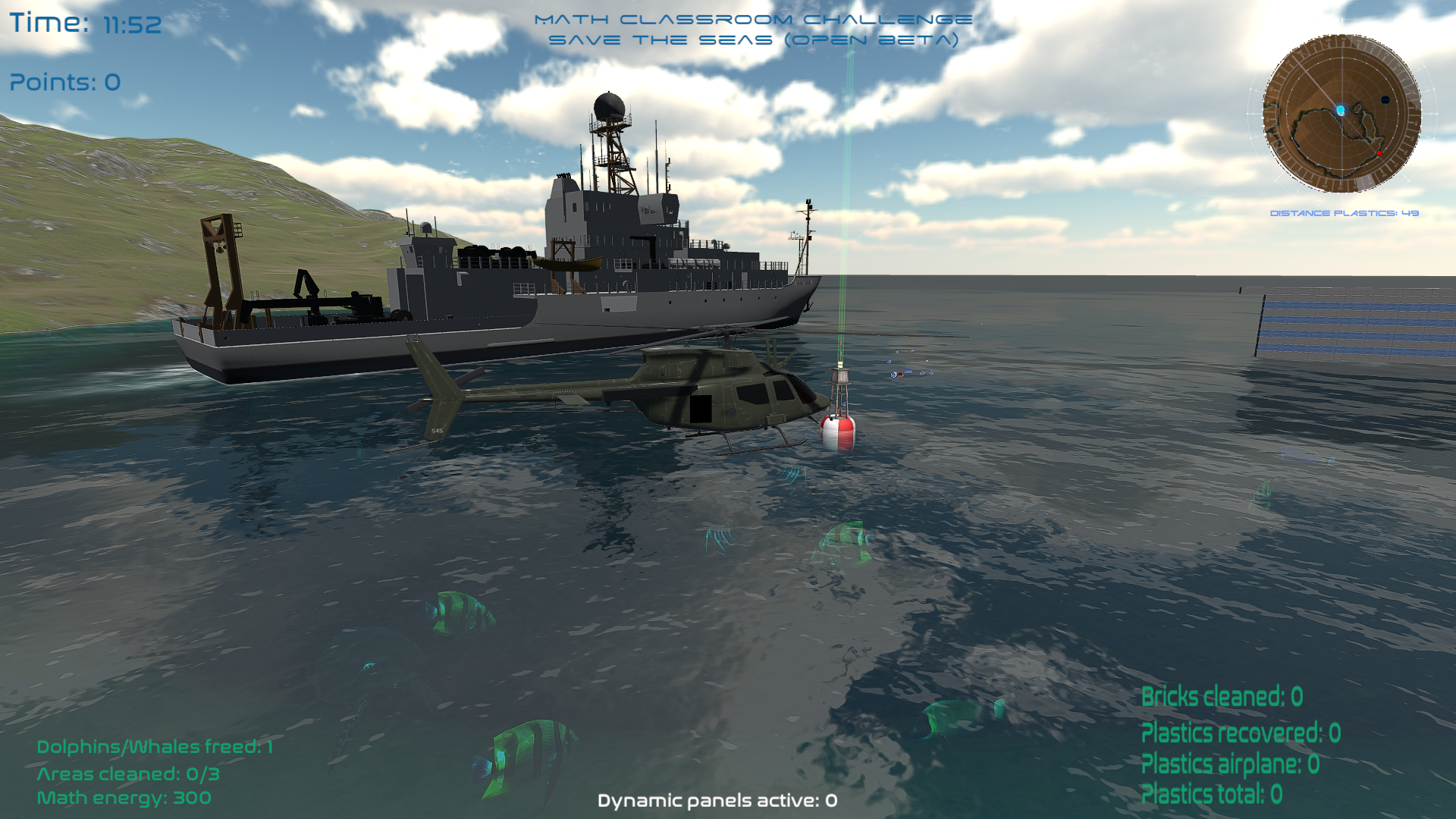 “Saving the seas” is the new scenery for “Math Classroom Challenge” 1.80. With the last scenery on the Moon we saved the world obtaining helium 3 for the fusion reactors. Now we go to the seas, to clean the oceans from plastics, and destroy the walls that avoid the marine species to move freely.