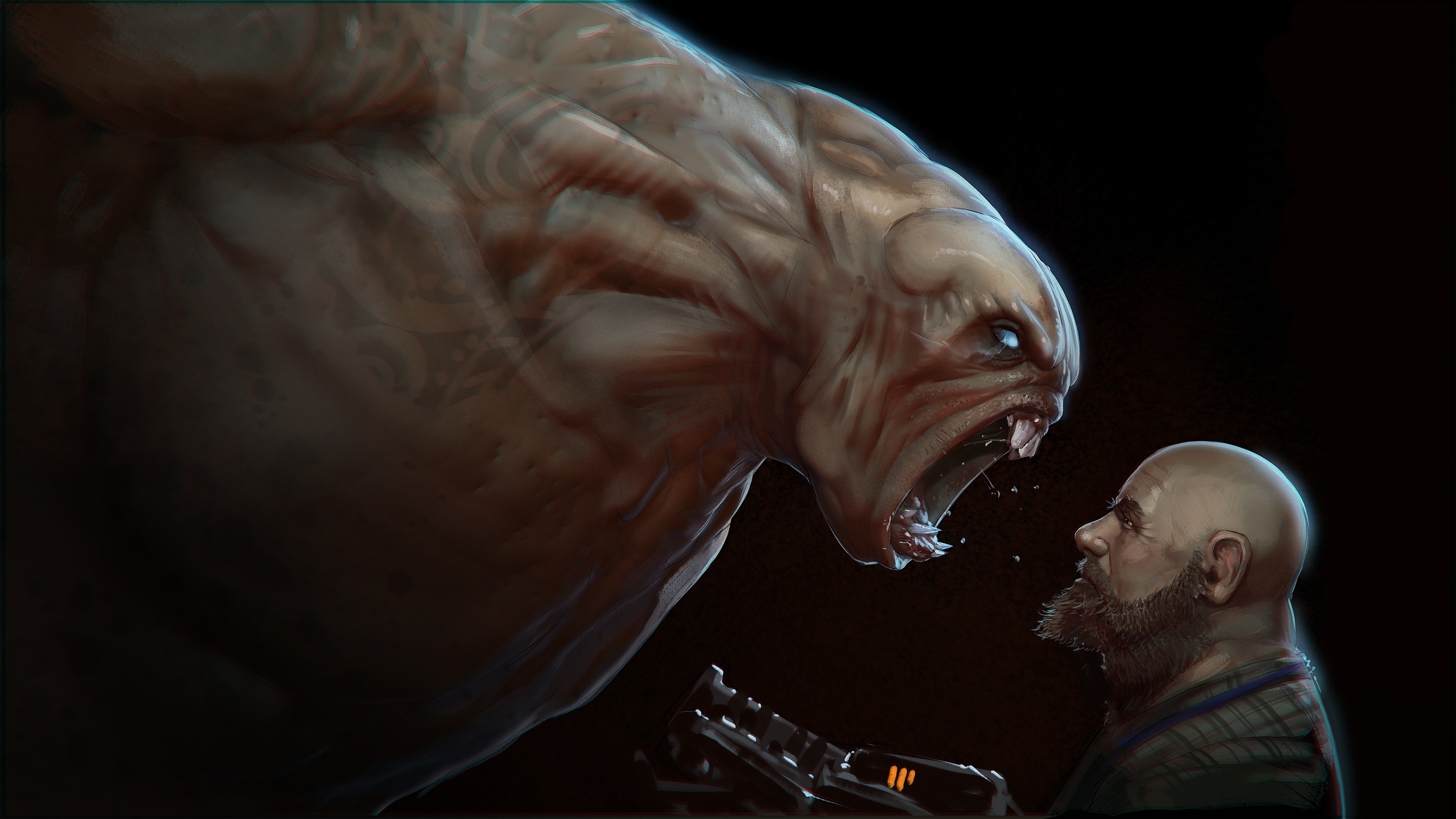 The aliens themselves are tiny creatures with squeaky voices who are cloning gigantic monsters who fight for them in the arena..