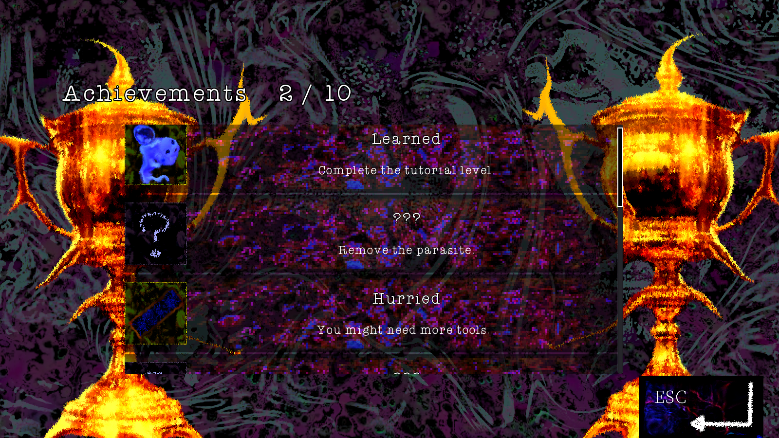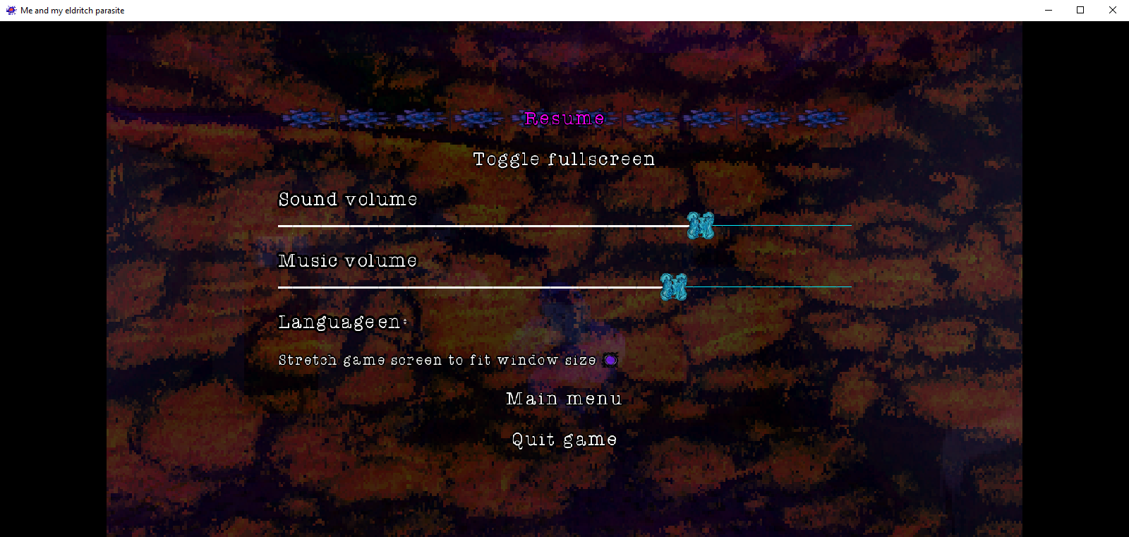 I’ve been working on adding a custom achievement system for future projects and decided to test it with this good old abominatio… err,game. I settled on in-game achievements over Steam ones so the feature remains avalaible to the plenty of (2 or 3) people that buy the Itch.io or Gamejolt versions of “Me and my Eldritch Parasite”. This update also adds a screen where you can view the achievement’s conditions and your current progress. The requirements for the achievements do not check for progress before the update (mostly because a system to check for that kinda didn’t exist in the old version), so returning players will have to meet the Eternal Residence’s lovely hosts once again.