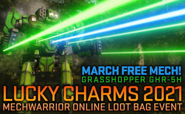 So as we shift focus to Q2 and the work to come, we look forward to getting into some of the more critical components of the MWO Roadmap with the community. We'll be coming directly to you, with Intel Gathering forum posts, Dev Vlogs, Community Podcasts, and Social Media requesting your input on 'Mech Rescale, Quirks, Agility, Spawn Point Fixes, Map Changes, Jump Jets, Ongoing Weapons Balance Changes, Continued Improvements to the New Player Experience, Solo, Group, and 8v8...yes, all that and more is getting started in Q2! We will also continue bringing you as many Events and Sales as we can manage to get out, including in-game events like the recent Dev and Streamer Hunts, and the monthly FREE 'Mechs including the current Lucky Charms Loot Bag Event with a FREE Grasshopper GHR-5H 'Mech! We also look forward to gaining experience with each patch, continuing to grow our MWO team, and increasing our efficiency and output each Quarter. We look forward to MWO Localization and the new players it will bring to our community. We look forward to new Content, starting with the Stryker Pack in April. We look forward to the attention MW5 will be receiving in the coming months, and the players that will inevitably find MWO as a result. And we look forward to making as many fixes, updates, and changes to MWO as we can, as fast as we can. So thank you for your continued input, feedback, and support MechWarriors!