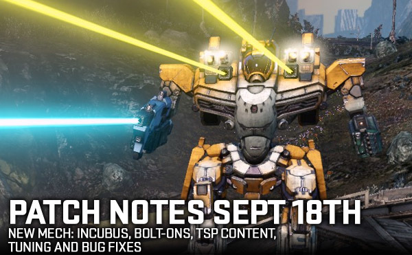 The September Patch is here and with it comes the release of the Incubus Mech, New Tournament Supporter Content, Bolt-Ons on more mechs, Tuning Changes and Bug Fixes!