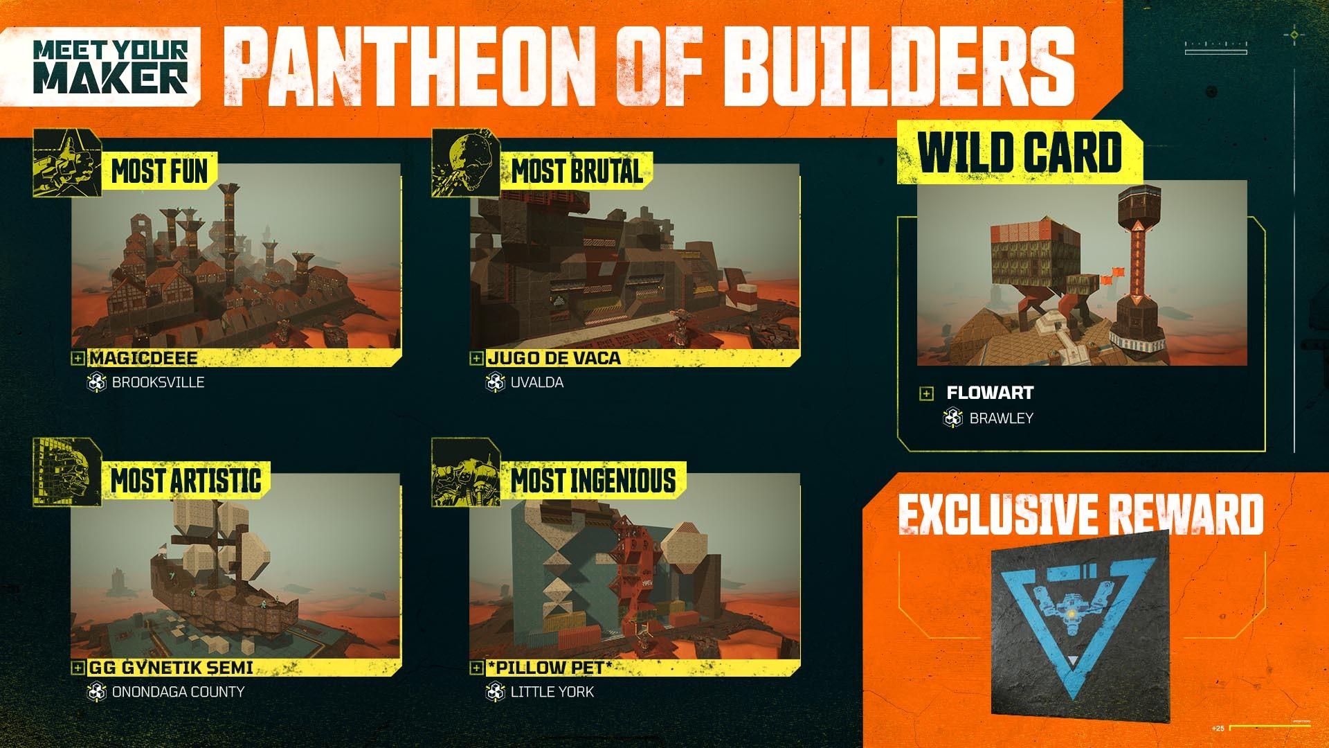 The Pantheon of Builders showcases some of the most creative and deadly Outposts in the game. For our Builders, it’s a way we can acknowledge and reward the time and effort it takes to make amazing Outposts. For Raiders, it’s a way of easily finding some of the best Outposts Meet Your Maker has to offer.