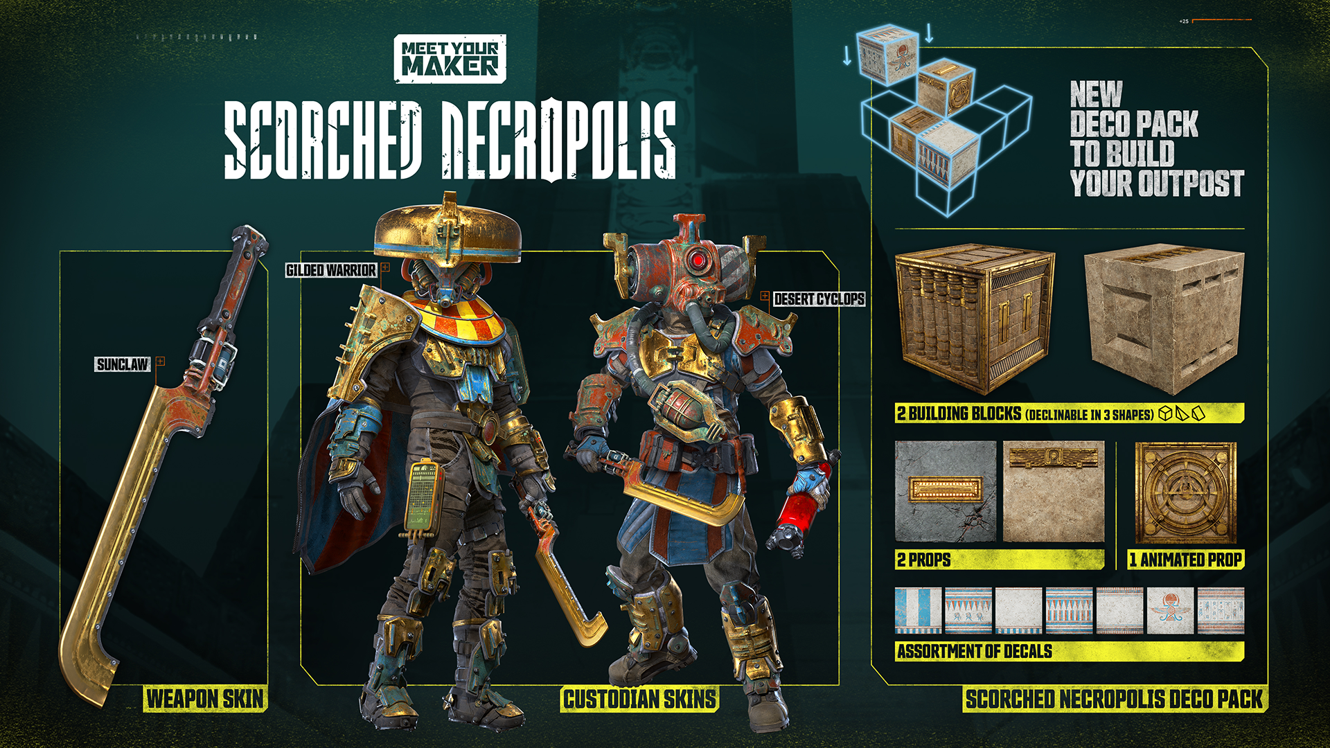 Purchase the Scorched Necropolis Collection DLC today and expand your Meet Your Maker experience with the deepest toolbox possible.