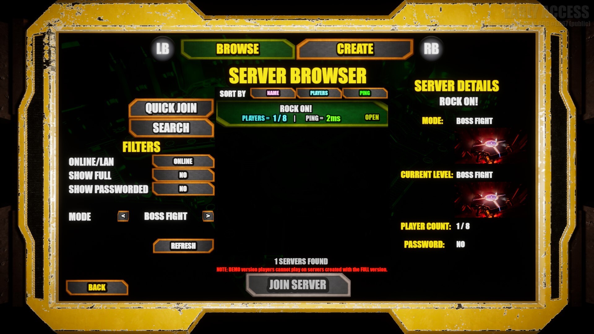 On top of that, during ONLINE play, both server and clients can bring up the "Pause" menu at any time. Previously it only worked for the host, which was a bit annoying if you were a client player and wanted to leave the game, or disconnect for whatever reason. Along with these changes, I have updated the multiplayer menu in the main menu to include quick buttons, for example, in the SERVER BROWSER, players using an Xbox controller can press the X button to quickly refresh the list, and in the CREATE SERVER window, the host can press the START button on their controller to start the server without manually navigating down to the CREATE SERVER button. It's only minor, but helps for players who like to get things set up quickly.