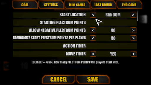 Comprehensive board game customization menu where players can tweak a plethora of values, board game mode goals, and their relevant settings.