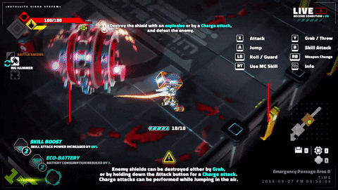 -Battle Tip No.3 [Charge Attack] Holding down the Attack button will unleash a Charge attack. The Charge attack can also destroy enemy shields. If a large robot, that Rona cannot Grab, is protected by a shield, Charge into it!