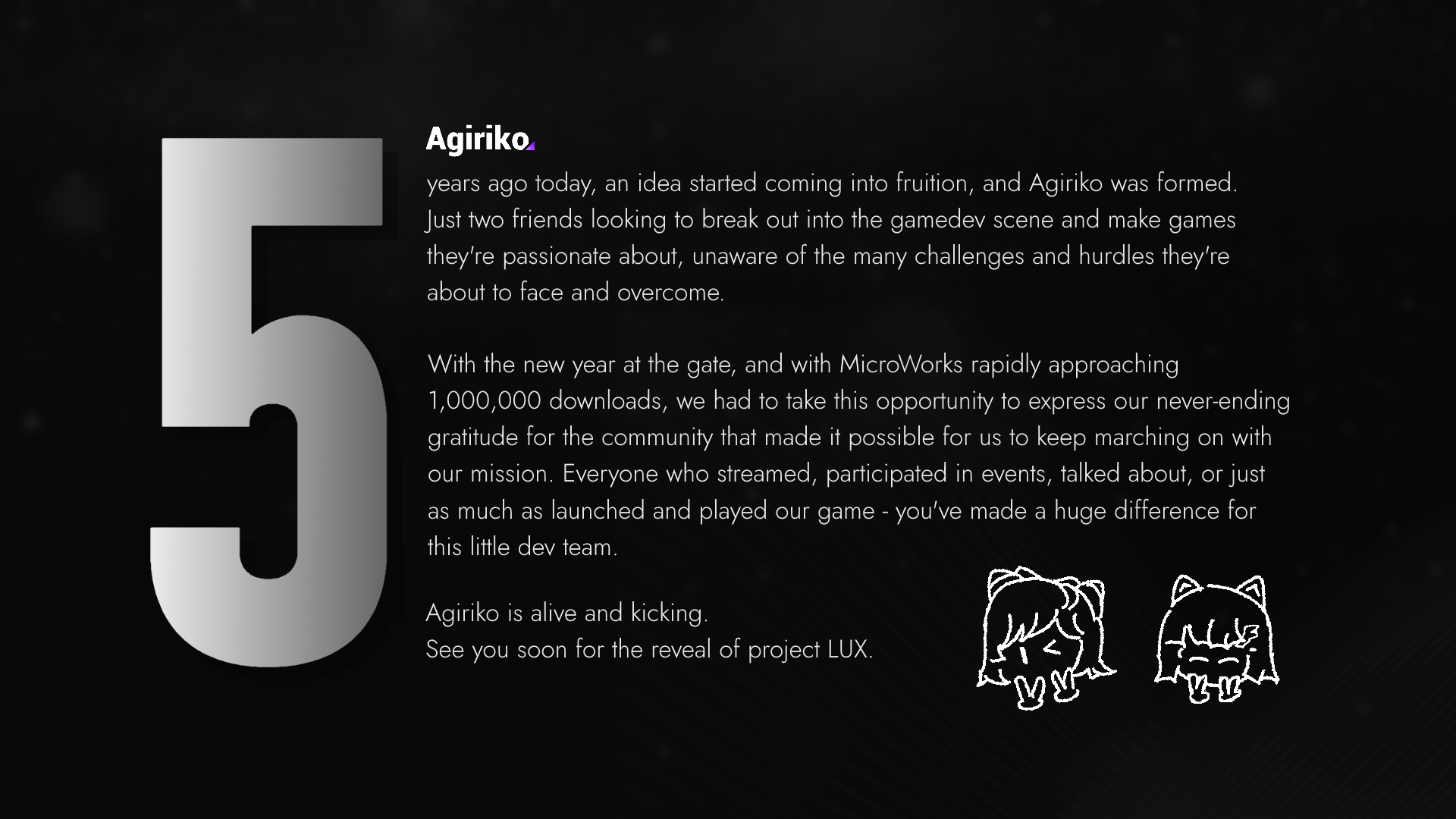 We've had the honor and privilege of supporting MicroWorks for over a year now, not to mention that Jan 1st marked 4 years since MicroWorks entered development. Now is the time for our next journey, to hopefully unveil our next big thing one day. And with everything we've learned along this path, we can't wait to find out what that is.