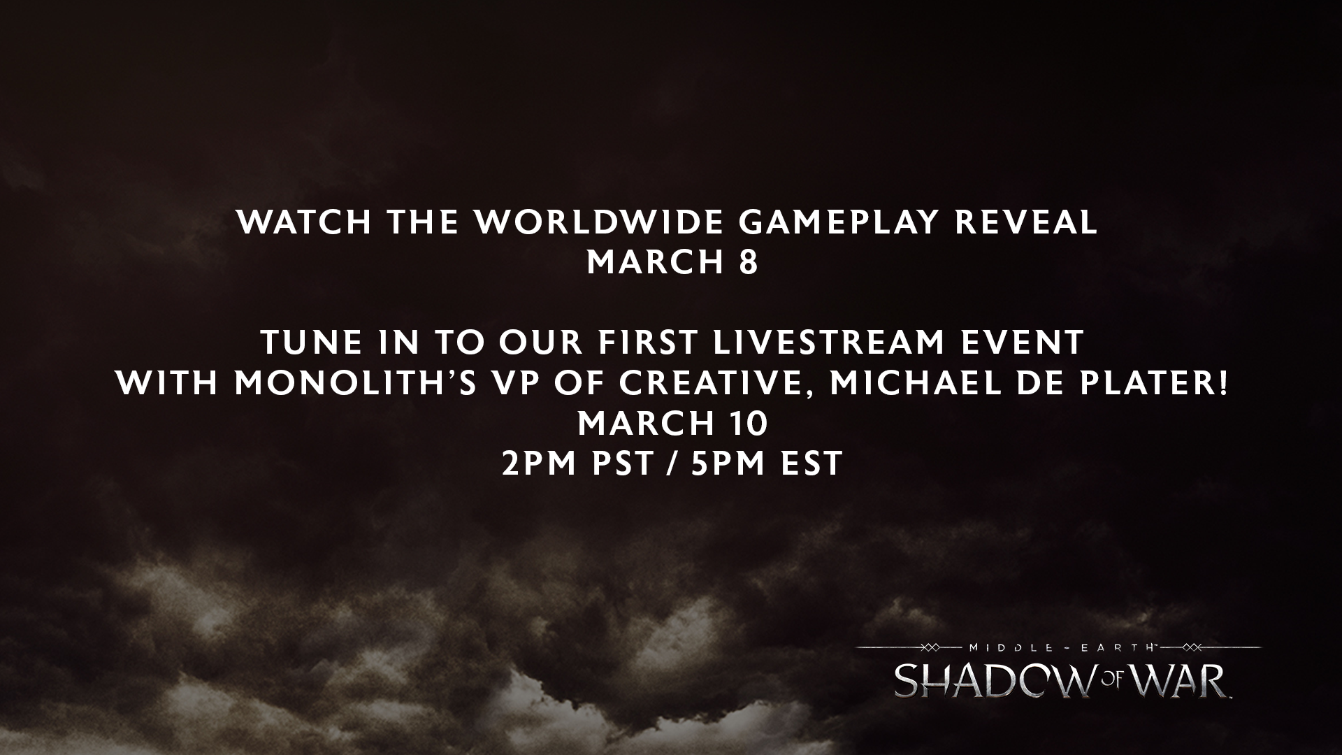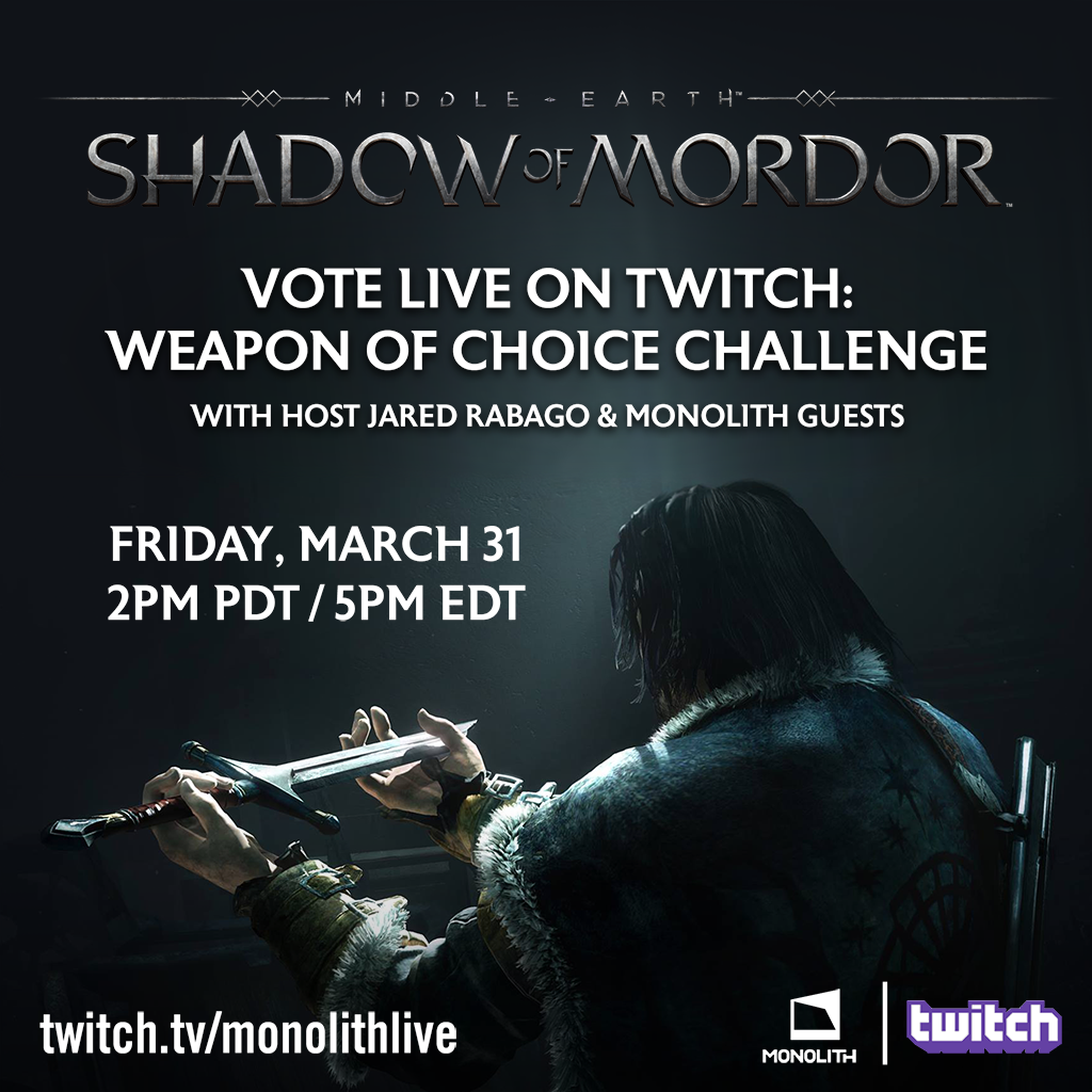 The Gameplay Trailer for Middle-earth: Shadow of War is finally upon us. And, as if that wasn't enough to keep your eyes busy for the next week – this Friday at 2 PM Pacific we're going to give you an up-close and personal look at it, alongside the VP of Creative at Monolith Productions, Michael de Plater live on Twitch!