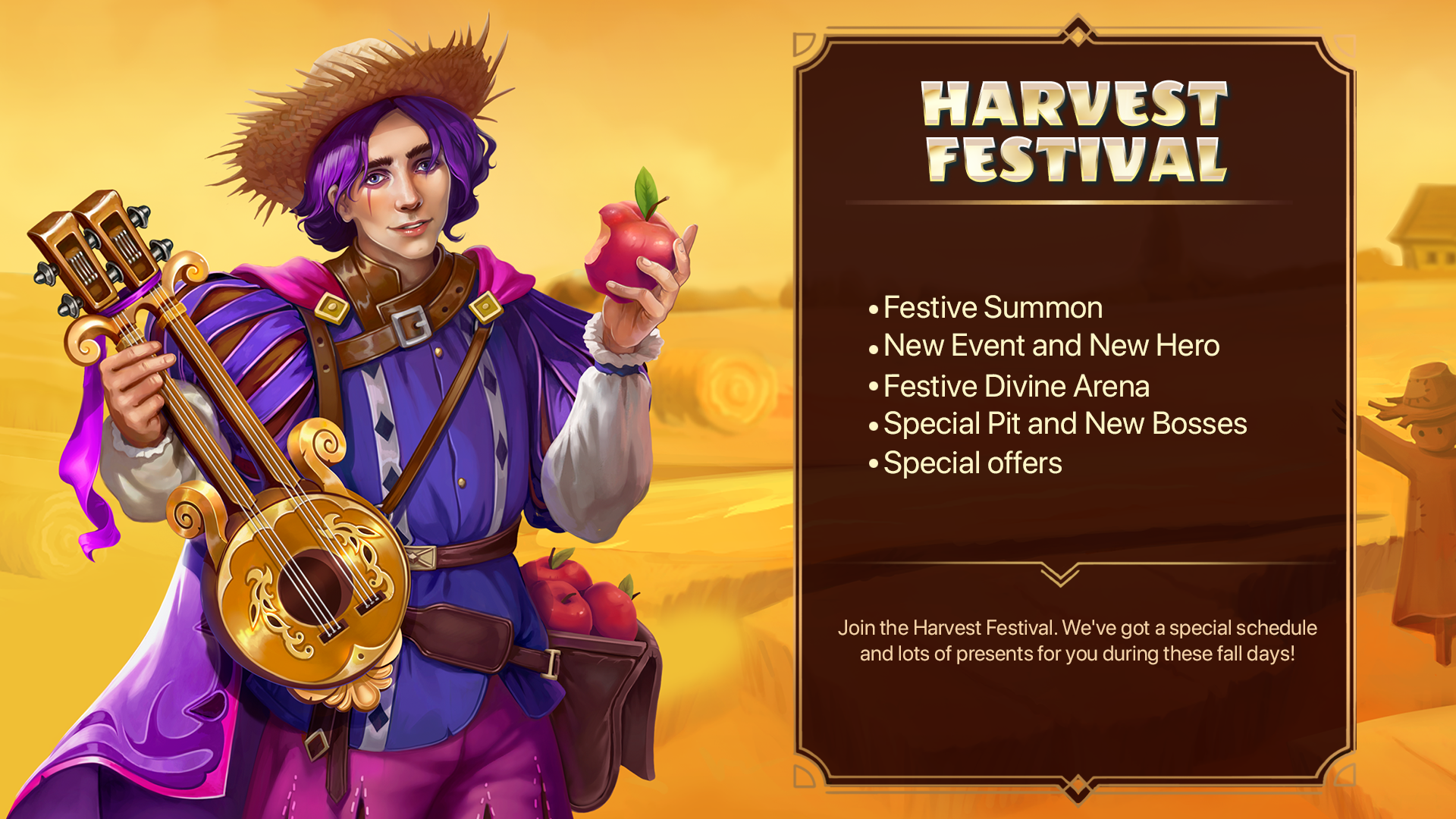 - No holiday is complete without a Wish Shop, which will be available from September 3 to 6; - From September 6 to 13 a special Celebration Pit will be available, and you will meet the most fearsome creatures of Pangea; - From September 7 to 9 we've prepared Special Offers for the most active players! - From September 10 to 16 there will be an event "Horn of Plenty" with a New Hero - Mosura Wind Breath! - From September 15 to 17 the gates of the Special Divine Arena will open; - From September 17 to 20 you'll be able to collect a fortune and have gems added to your coffers for taking part in the High Growth fable; - From September 20 to 23 you'll be able to use the Festive Summon to join your squad with new and beloved heroes.