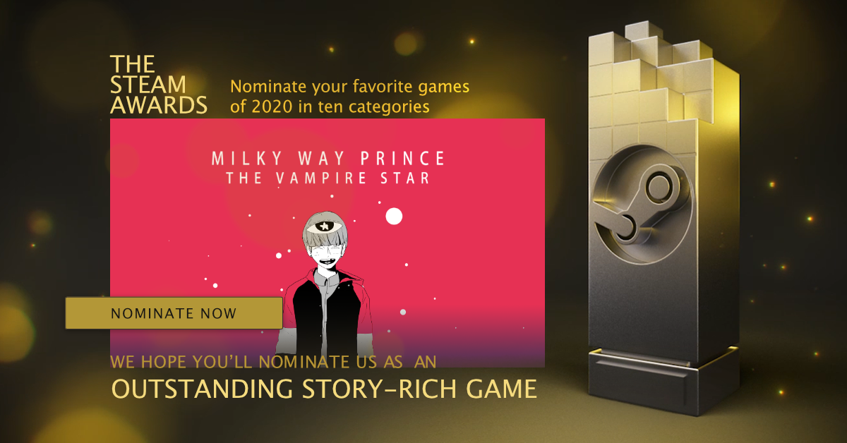 Please help us nominate Milky Way Prince as an Outstanding Story-Rich Game in the Steam Awards! Here is the link to cast your nominations: https://store.steampowered.com/steamawards/nominations