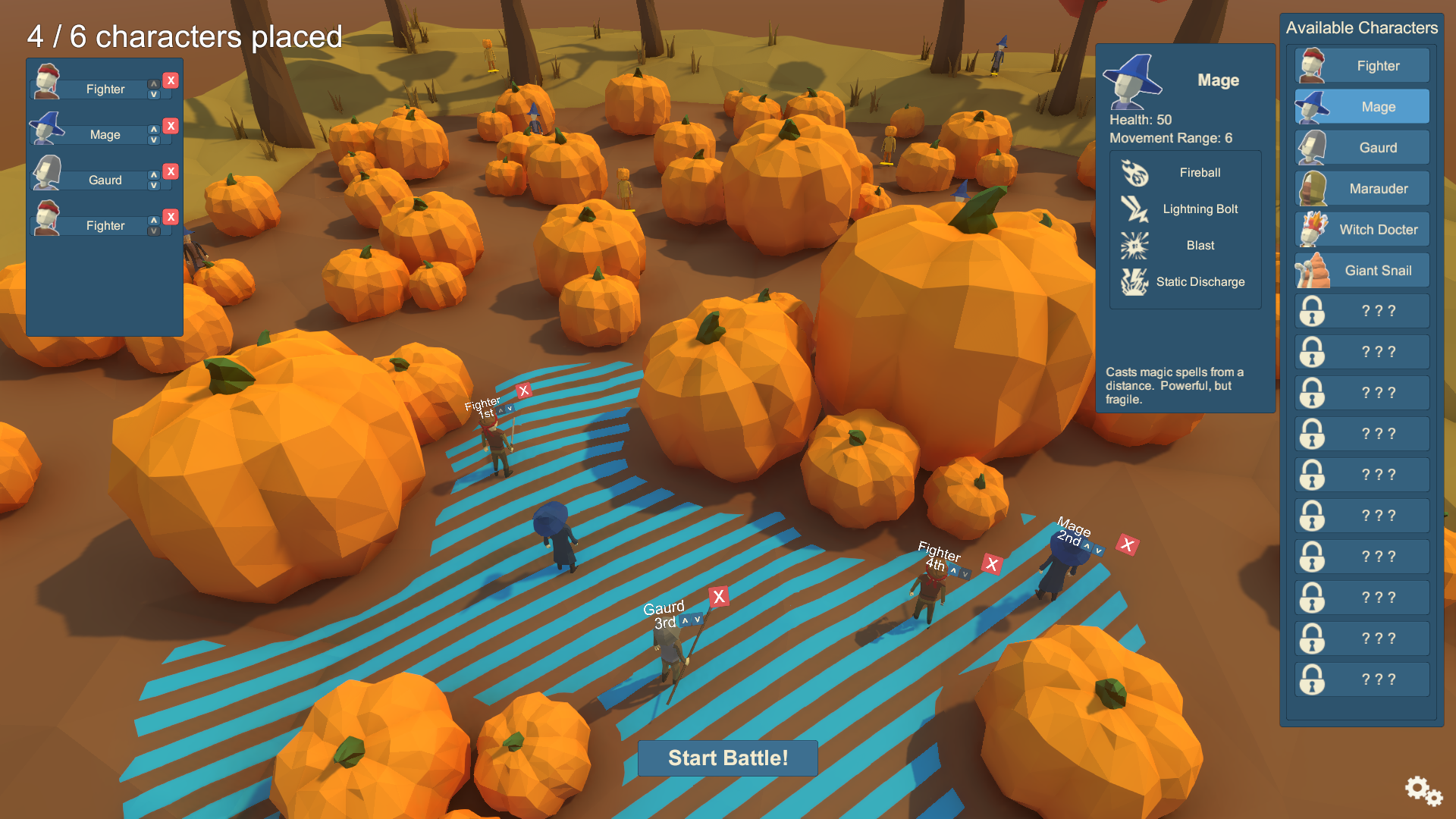 Each battle begins by choosing up to six characters from the classes you’ve unlocked and placing them into the map’s designated “starting zone”. Since individual characters are not persistent between battles and do not level-up, you're encouraged to experiment with whatever combination of characters you think will be most effective for that given battle (or just whichever ones you prefer).