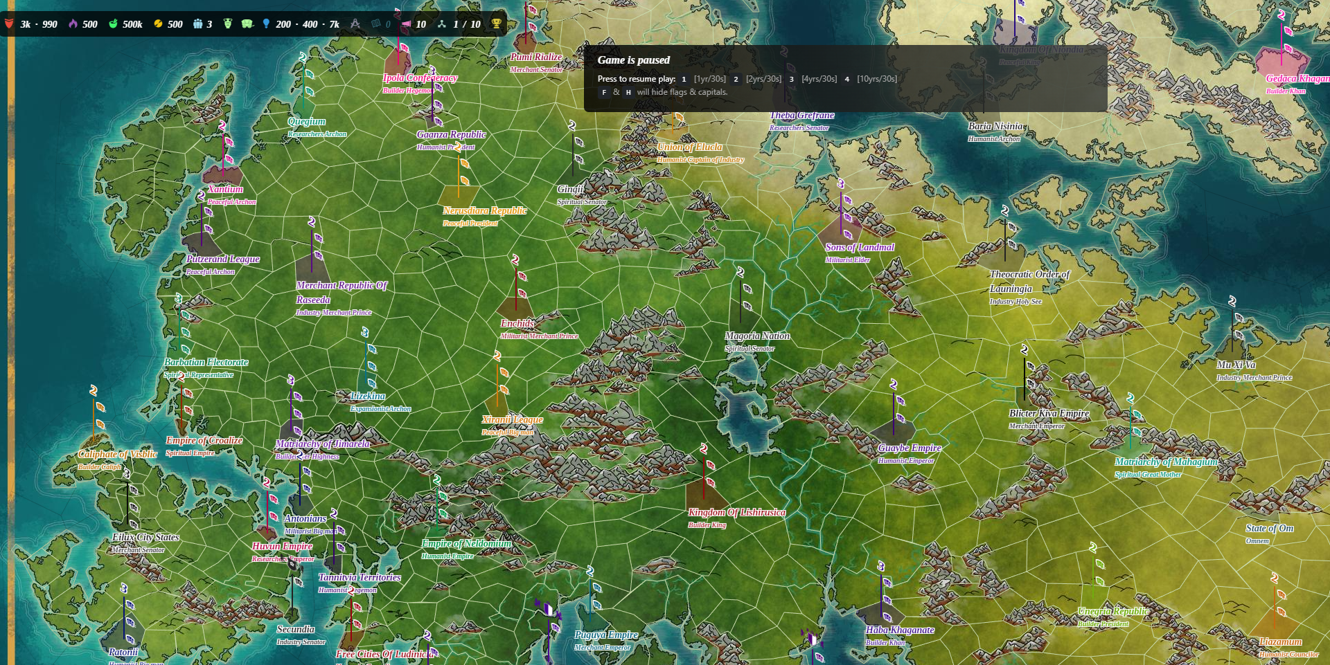 - "Population from other sources" would not affect total pop - Population growth beyond 5M would yield lower growth per turn than it should have. - Fixed 12 bugs with ideology effect presentation. Missing % etc. - Loading heraldries was bugged on steam. - Heraldries would lose color on some pages after the first war was declared - Casus Bellis effects were hidden - Trading with vassals was not possible - Discord link was broken - When starting a single-player game, choosing a manual spawn twice would hide the map the second time. - Maunal spawn map was not showing for Quakia and another 2 maps [only the province]. - There was a rare instance when you could get 2 stories instead of the 2nd chapter of a story. - There was an island on Alangakara that was incorrectly labelled as archipelago. - There were three other provinces on Alangkara with a bad tag. - There was an issue embarking on an MMO continent [misconfiguration at sim start] - There was an issue with food decay on the MMO version. - There was an issue with sim setup. It caused the embarkation bug and another issue. - There was an issue with sim destruction. - One question was tagged as multichoice when it was single-choice.