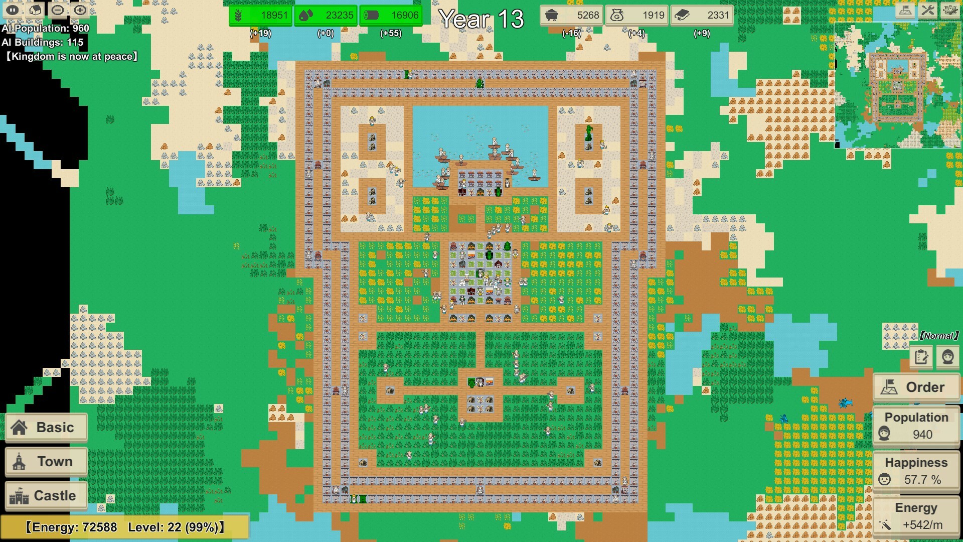 - Added a new minimap system. - Added a small map switch button. - Added minimap automatic focus. - Added extra free range for lenses. - Added better AI for villagers to go home. - Added the function of automatically and continuously building city walls. - Added the function of automatically destroying buildings continuously. - Improved main menu. - Improved difficulty selection. - Improved color selection. - Improved unit status UI. - Improve king status UI. - Improved enemy status UI. -Improve AI's fighting style. - Improved AI population and building display. - Improved AI attack and peace display. - Improved AI large town building time. -Improved AI fort building time. - Improved AI population growth rate. - Improved teaching system. -Improve the camera tracking lock function. - Improved town building order. -Improve the minimap to zoom freely. -Improve the large map camera to zoom more freely. - Improved castle UI. -Improved time and frame rate system. - Improved performance and unit collision. -Improved system performance for physics collisions. -Improved balance and reduced gold consumption. -Improve balance and reduce knowledge consumption. -Improve the balance and reduce the HP of the building after it is occupied. -Improve the balance of the blood volume of the city wall. -Improved balance to increase builder repair amount. -Improve balance and reduce AI base population. - Improve the defensive effect of defensive buildings and walls. - Improved hints when resources are low. - Improved building and terrain UI order. - Improved preset terrain selection roads. - Improved speed and terrain display. - Improved castle defense display. - Improved initial happiness. -Improve the calculation problem of the number of buildings. -Improved to increase the healing amount of villagers when returning to the building to rest. -Improved to increase the amount of repairs when villagers return to the building to rest. - Improved dragoon battalion range description. -Improve the range of sound effects. - Improve BGM. - Improved sound range. -Improve the effect of raising player's restaurant and chef. -Improve and reduce the happiness loss of villagers' death and injury. -Improve the game frame rate and dynamic computing system. - Improved late game performance. - Improved late game villager movement graphics. - Improved villager auto production when building. -Improve and increase the service scope of town citizens. -Improved happiness changes for villagers needing dwellings. -Improve the UI display of the number of buildings. - Improved calculation of mana required for buildings. -Improve and reduce the resource consumption of dragoons. -Improved to increase the happiness of construction workers repairing buildings. -Improve the happiness of villagers treated by doctors. -Improvements Increase the happiness of services provided by citizens of various towns. - Improved AI population and resource stat reporting. -Improve the calculation method of AI food happiness. -Improved description and translation of villager rebellion. - Improvements to reduce the chance of buildings needing maintenance. -Improve the chance of villagers returning home. -Improved to increase the movement speed of villagers. - Improved farm and worker house order.