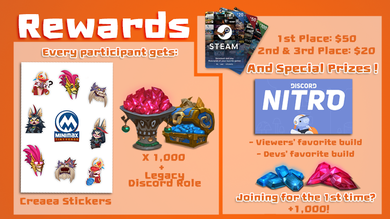 We also have special prizes! People competing in a MINImax Tournament for the first time will win an extra 1,000 Red/Blue; MINImax Community’s favorite team build and Dev Team’s favorite team build will both win a month of Discord Nitro; After the Stream of the Finals, one lucky viewer will be picked randomly to win a month of Discord Nitro.