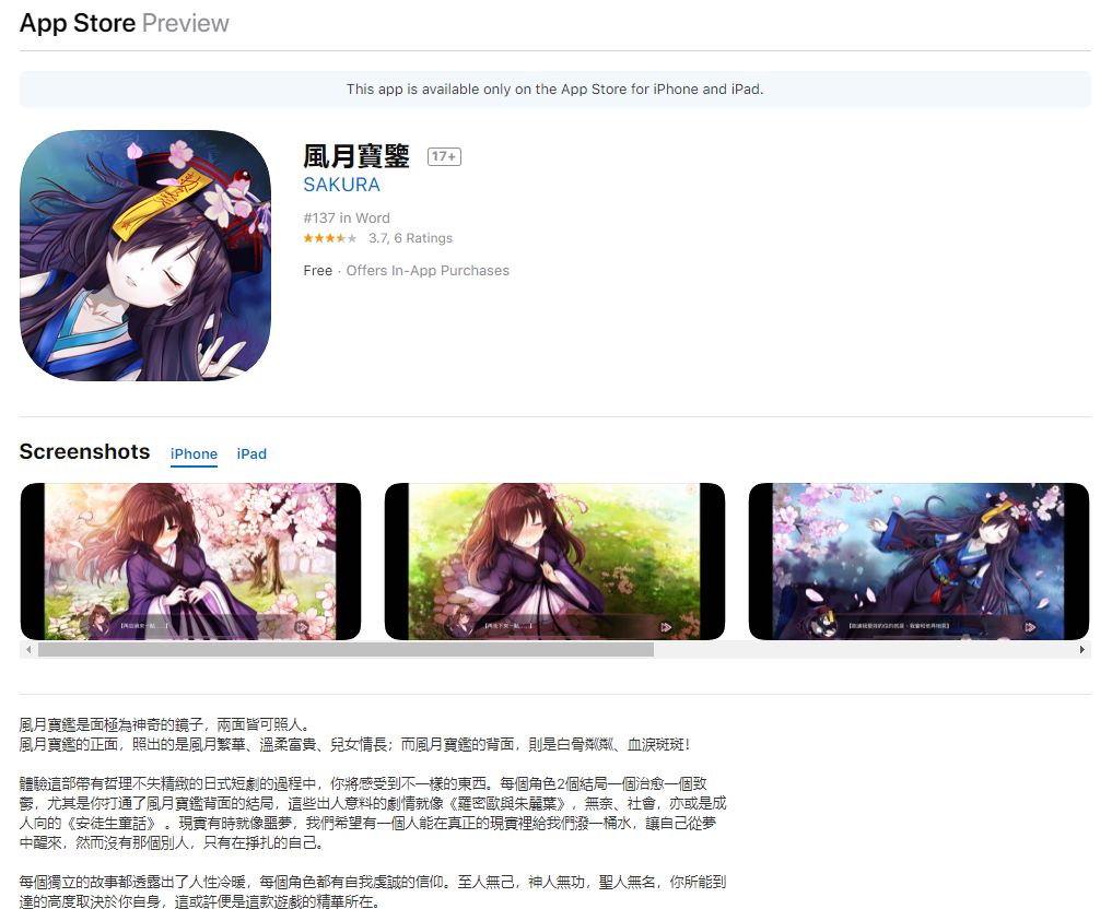 Please search 風月寶鑒 directly in App Store or search Mirror, drag all the way to the bottom and find 風月寶鑒 under "More by SAKURA".