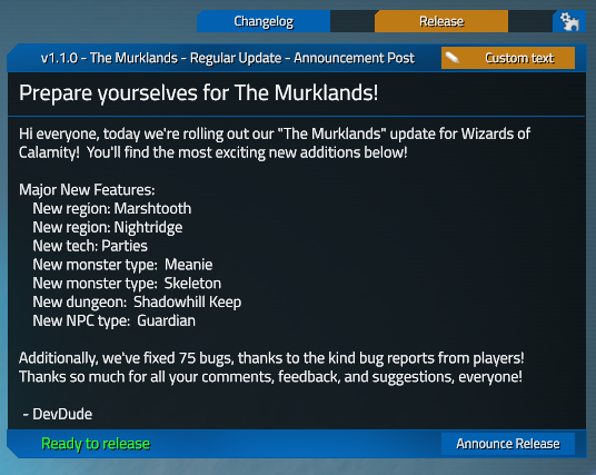 - Release celebration! My producer wanted me to say something here about the celebration sequence that happens when you release a regular or major update to your game. But honestly, I think that's better left as a surprise, so maybe I just won't say anything and you'll never see it coming!