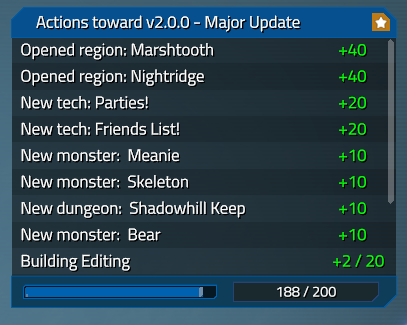 Central to the new progression system is this, the changelog. Near the top right corner of the screen, the Changelog shows the most major changes you've made to your game since your last release. This contains stuff like new monster types, new player classes, new regions to explore, and so on. Seeing how long this changelog is can give you a rough idea of how exciting your upcoming release is going to be for your current and future players.