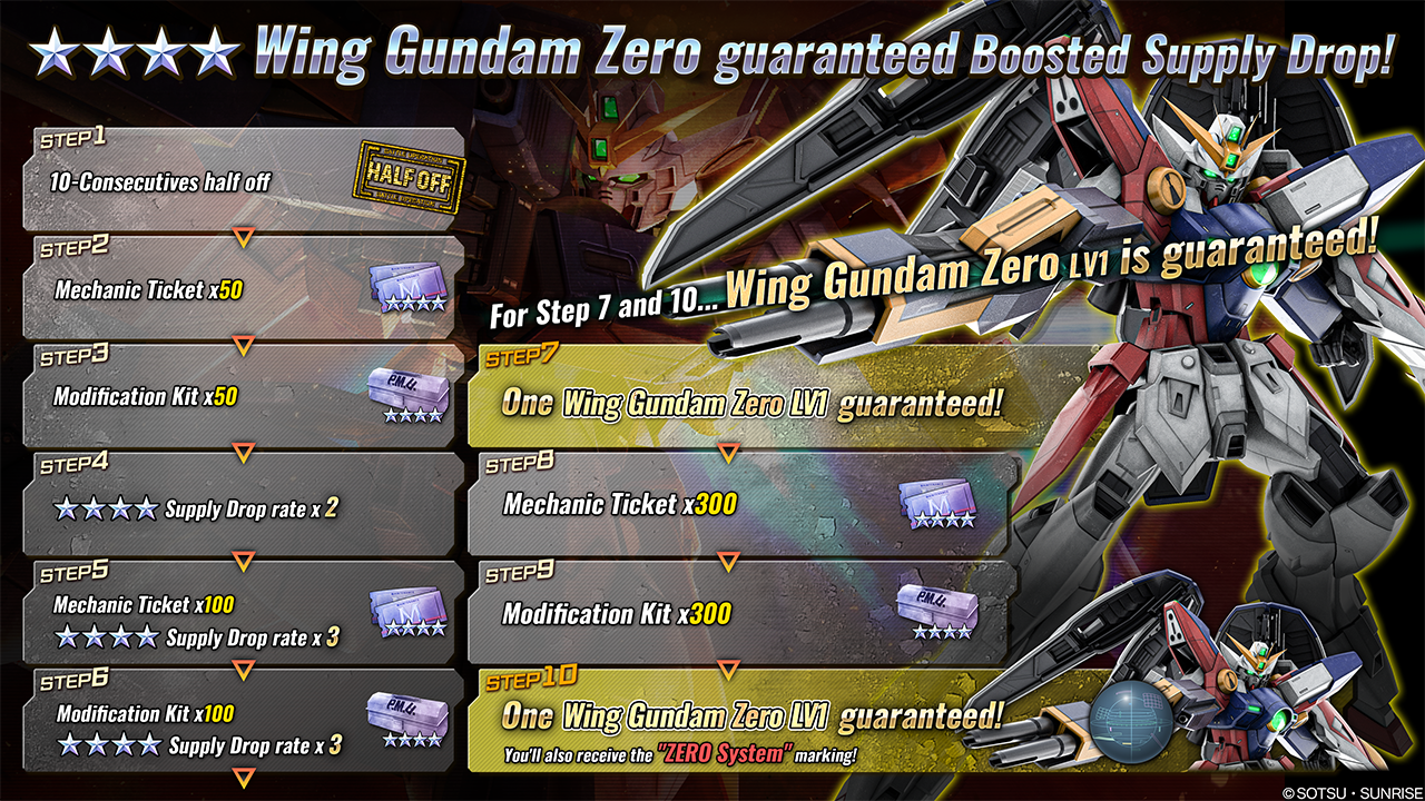 ■Content A Supply Drop, in which 10 consecutive Supply Drops can be requested up to STEP10. The STEPwill progress by 1 each time you perform a request, as STEP1 → STEP2 → STEP3 → STEP4 → STEP5 → STEP6 → STEP7 → STEP8 → STEP9 → STEP10. After STEP10 is requested, Boosted Supply Drop will be over. ・STEP1 (15 Tokens): Tokens 50% OFF! ・STEP2 (30 Tokens): 50 ★★★★ Mechanic Tickets for bonus! ・STEP3 (30 Tokens): 50 ★★★★ Modification Kits for bonus! ・STEP4 (30 Tokens): ★★★★ materials drop rate x2! ・STEP5 (30 Tokens): ★★★★ materials drop rate x3! + 100 ★★★★ Mechanic Tickets for bonus! ・STEP6 (30 Tokens): ★★★★ materials drop rate x3! + 100 ★★★★ Modification Kits for bonus! ・STEP7 (30 Tokens): 1 “Wing Gundam Zero LV1” guaranteed! ・STEP8 (30 Tokens): 300 ★★★★ Mechanic Tickets for bonus! ・STEP9 (30 Tokens): 300 ★★★★ Modification Kits for bonus! ・STEP10 (30 Tokens): Another “Wing Gundam Zero LV1” guaranteed!+ Mark "ZERO System" for bonus!