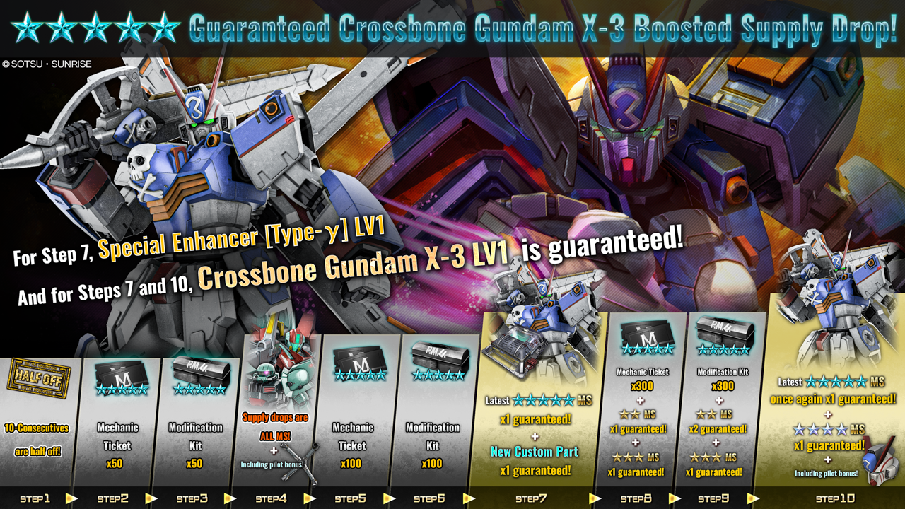 ■Content A Supply Drop, in which 10 consecutive Supply Drops can be requested up to STEP10. The STEP will progress by 1 each time you perform a request, as STEP1 → STEP2 → STEP3 → STEP4 → STEP5 → STEP6 → STEP7 → STEP8 → STEP9 → STEP10. Once STEP10 is completed, the STEP UP Supply Drop will end. ・STEP1 (15 Tokens): Tokens 50% OFF! ・STEP2 (30 Tokens): ★★★★★ Mechanic tickets x50 for bonus! ・STEP3 (30 Tokens): ★★★★★ Modification kits x50 for bonus! ・STEP4 (30 Tokens): ALL drops will be MS! + Accessory "Backpack: X-3" for bonus! ・STEP5 (30 Tokens): ★★★★★ Mechanic tickets x100 for bonus! ・STEP6 (30 Tokens): ★★★★★ Modification kits x100 for bonus! ・STEP7 (30 Tokens): “Crossbone Gundam X-3 LV1” x1 guaranteed!! + Custom part “Special Enhancer [Type-γ] LV1” for bonus! ・STEP8 (30 Tokens): ★★ MS x1 & ★★★ MS x1 guaranteed!! + ★★★★★ Mechanic tickets x300 for bonus!! ・STEP9 (30 Tokens): ★★ MS x2 & ★★★ MS x1 guaranteed!! + ★★★★★ Modification kits x300 for bonus! ・STEP10 (30 Tokens): Another “Crossbone Gundam X-3 LV1” guaranteed!! + ★★★★ MS x1 guaranteed!! + Accessory “Mask: X-3” for bonus!