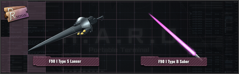 ■Main weapons ・★★ F90 I Type S Lancer LV2 added ・★★ F90 I Type B Saber LV2 added ※The materials mentioned above will be available at the Recycle Counter, from [JST] 02/12/2026 – 02/19/2026.