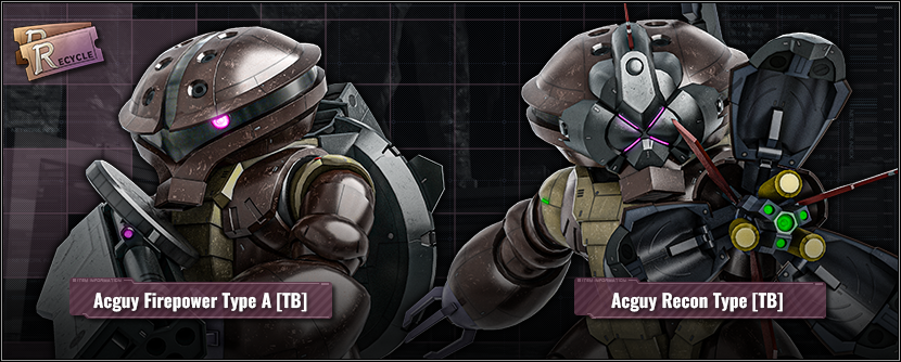 ■New Materials for exchange are added to Recycle Counter. ⇒ Information about newly added materials ■Units ・★★ Acguy Firepower Type A [TB] LV1 added ・★★ Acguy Recon Type [TB] LV1 added ※The materials mentioned above will be available at the Recycle Counter, from [JST] 07/24/2025 – 07/25/2025.