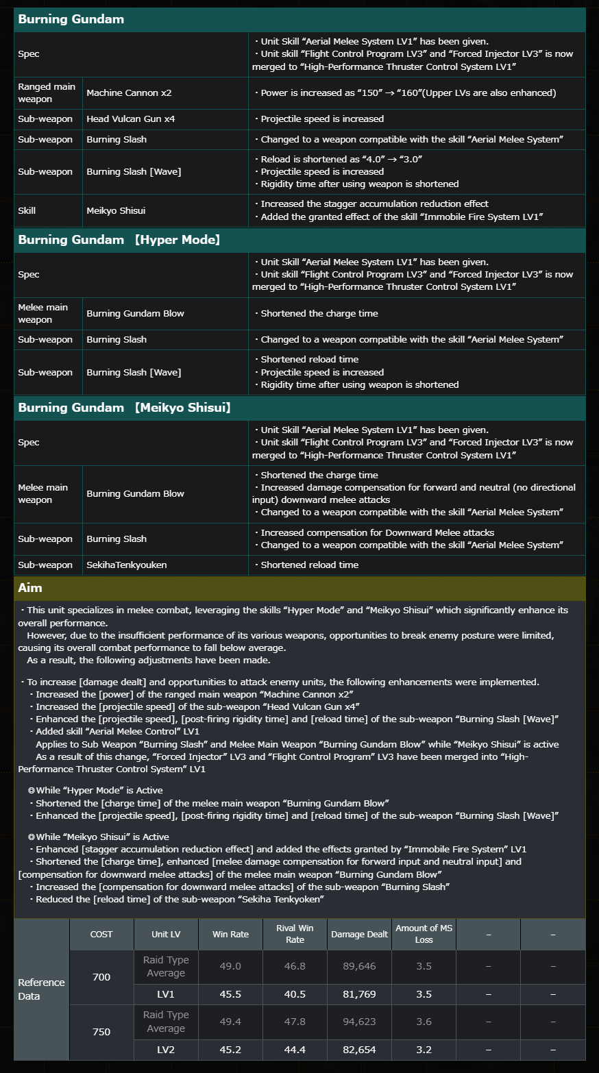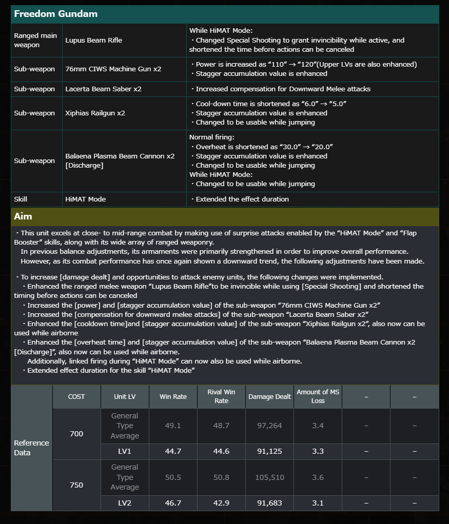 Spec ・Unit skill “Release Ranged Output Limiter LV1” has been given ・Unit skill “Flexible Thruster LV1” has been given ・Unit skill “Aerial Melee System LV1” has been given ⇒LV3 and above unit skill “Aerial Melee System LV2” has been given ・Unit skill “Glide Structure LV3” is adjusted to “LV4” ・Unit skill “Maneuver Armor LV2” is adjusted to “LV3” ⇒LV2–3 Unit skill “Maneuver Armor LV2” is adjusted to “LV4” ⇒LV4 Unit skill “Maneuver Armor LV4” is adjusted to “LV5” ・LV3 and above unit skill “Forced Injector LV2” is adjusted to “LV3” ・LV3 and above unit skill “Offense System LV1” is adjusted to “LV2” ・LV3 and above unit skill “Flight Control Program LV3” is adjusted to “LV4” Ranged main weapon: GP02A Beam Bazooka ・Cool-down time is shortened as “5.5” → “5.0” ・Overheat is shortened as “23.0” → “16.0” ・Focus is shortened as “5.5”→”5.0″ ・Can now have two-stage focus fire 1st stage: ・Fires a high-powered beam that causes a strong stagger on hit 2nd stage: ・At the 2nd focus stage, the beam’s power and range are further increased, partially negating the target’s beam resistance and creating an explosion at the point of impact Melee main weapon: High-Output Beam Saber ・Changed to a weapon compatible with the skill “Aerial Melee System” Sub-weapon: Head-Mounted Vulcan [TYPE II] ・Replaced with new sub-weapon “[BB Type] Head-Mounted Vulcan” Sub-weapon: [BB Type] Head-Mounted Vulcan ・New added Improved from the original spec of “Head-Mounted Vulcan [TYPE II]” ・Power is increased as “90” → “100” ・Stagger accumulation value is enhanced