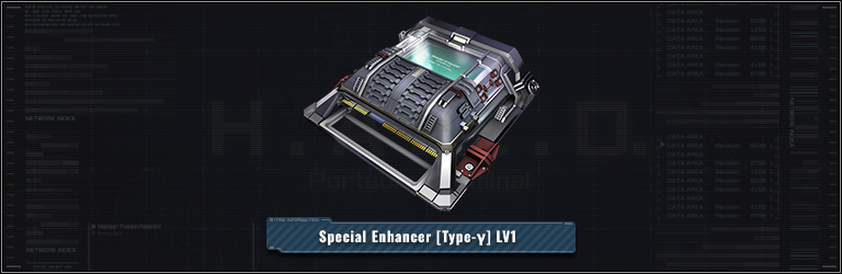 ■Custom part Special Enhancer [Type-γ] LV1 Spec: Increases ballistic, beam and melee resistance by 14%. Increases unit HP by 1200. Note that multiple special enhancer parts cannot be equipped at once.