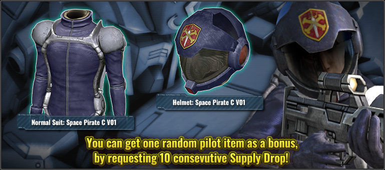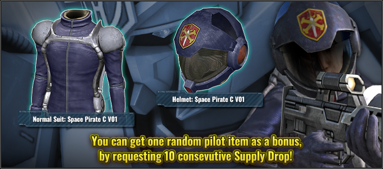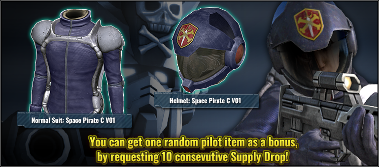 ■Bonus Item Contents (get 1 of the 2 items randomly listed below) ■Wear Normal Suit: Space Pirate C V01 ■Accessory Helmet: Space Pirate C V01 ※Requesting 10-consecutive Supply Drops during the campaign will grant you an additional 11th supply drop, and get 1 extra item. ※Single Supply Drop is NOT applied with this benefit. The bonus item will not be awarded even if you request the 1-Attempt Supply Drop ten times in a row.