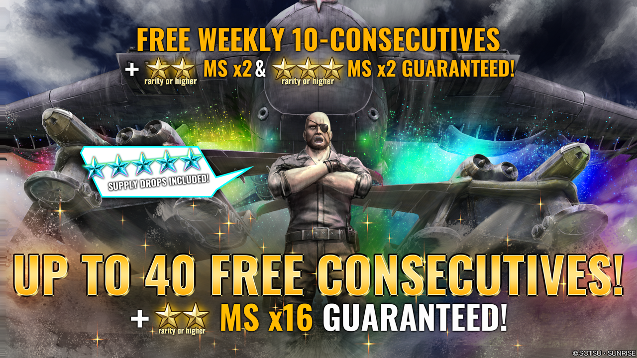 ■Content During the Period, Special Supply Drops (10 times) that includes all MS and Weapons previously available in past drops can be requested for free once a week. (Up to 40 drops!) Furthermore, 2 ★★ rarity or higher MS + 2 ★★★ rarity or higher MS is guaranteed in each Drops! (Up to 8 ★★ rarity or higher MS + 8 ★★★ rarity or higher MS is guaranteed!)