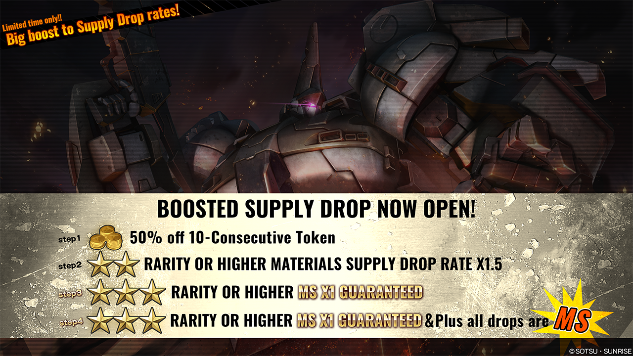 ■Contents A Supply Drop, in which 10 consecutive Supply Drops can be requested up to STEP3. The STEP will progress by 1 each time you perform a request, as STEP1 → STEP2 → STEP3. After STEP3 is requested, Boosted Supply Drop will be over. ・STEP1 (15 tokens): 1 COST 750 MS guaranteed! + 50% token off! ・STEP2 (30 tokens): 2 COST 750 MS guaranteed! + 100 ★★★ Mechanic tickets as a bonus! ・STEP3 (30 tokens): 2 COST 750 MS guaranteed! + 100 ★★★★ Mechanic tickets as a bonus!