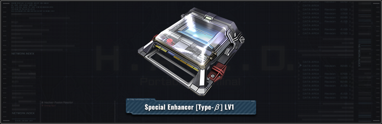 ■Custom part ◎Special Enhancer [Type-β] LV1 ・Increases ranged strength 20%. Increases unit HP by 1000. Note that multiple special enhancer parts cannot be equipped at once.