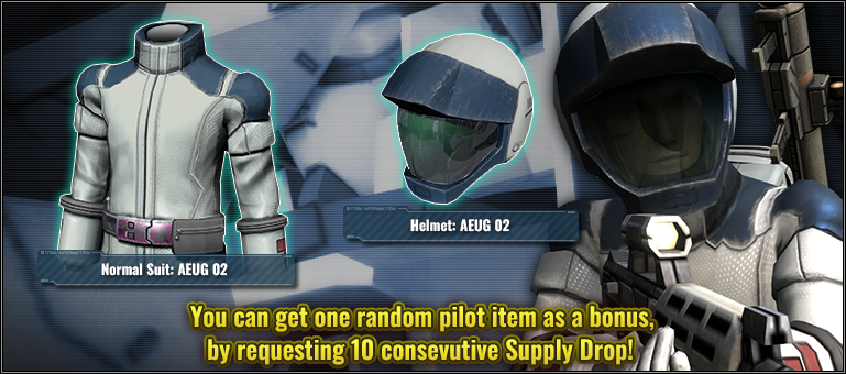 ■Bonus Item Contents (get 1 of the 2 items randomly listed below) ■Wear Normal Suit: AEUG 02 ■Accessory Helmet: AEUG 02 ※Requesting 10-Consecutive Supply Drops during the campaign will grant you an additional 11th supply drop, and get 1 extra item. ※Single Supply Drop is NOT applied with this benefit. The bonus item will not be awarded even if you request the 1-Attempt Supply Drop ten times in a row.