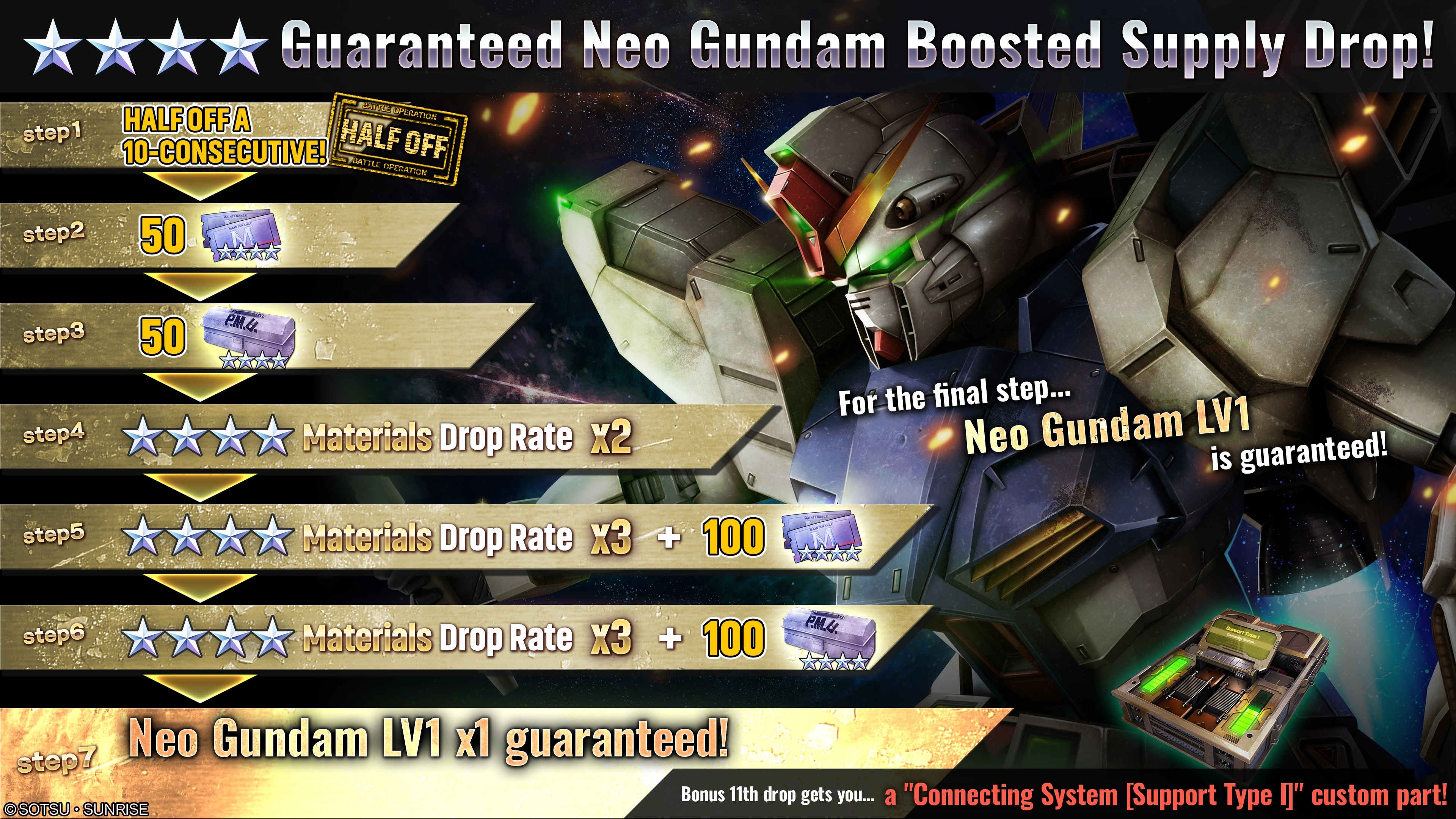 ■Notice of [Big Boost to Supply Drop Rates Campaign] Some of the newly added materials will have a boost to their supply drop rates for a limited time. ■Period [PST] 01/29/2026 00:00 – 02/04/2026 20:30 [Scheduled] [CET] 01/29/2026 09:00 – 02/05/2026 05:30 [Scheduled] ■Featured material that will benefit from the Big Boost to its Supply Rate ・★★★★ Neo Gundam LV1 (Support unit, ground/space uses, cost: 750) ■Supply Drops that will benefit from Big Boost to Supply Rates ・Normal Supply Drop ※After the end of the campaign, all supply drop rates will be the same as other materials.