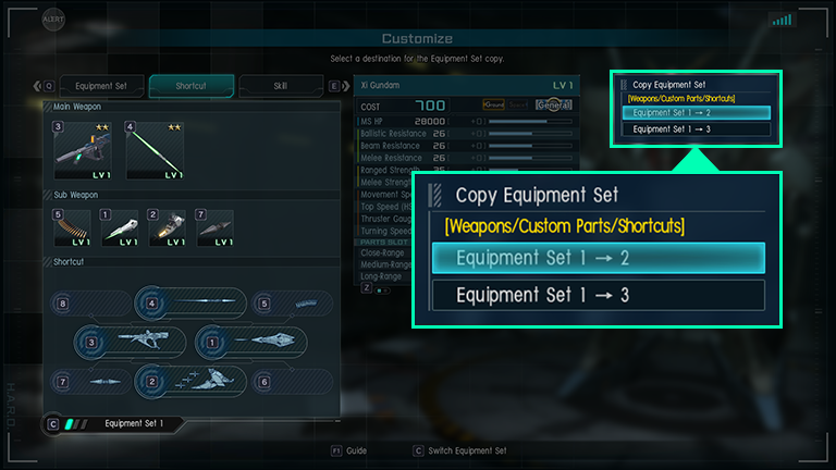 ■Items which can be duplicated ・Equipped main weapon ・Equipped custom parts ・Sub-weapon ON/OFF settings ・Shortcut settings ・Sub-weapon ON/OFF settings during transformation ・Shortcut settings during transformation ※“Copy Equipment Set” feature can only be used for the MS currently being customized.