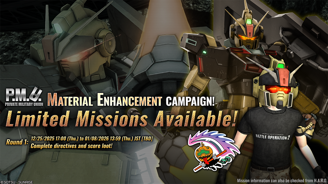 ■P.M.U. Material Enhancement Campaign Starting from [PST] 12/25/2025 / [CET] 12/25/2025, P.M.U. Material Enhancement Campaign will begin. ■Period [PST] 12/25/2025 00:00 – 01/21/2026 20:59 [Scheduled] [CET] 12/25/2025 09:00 – 01/22/2026 05:59 [Scheduled] ■Content During the period, basic rewards and container rewards will be boosted, and time-limited missions with extra rewards will be available to all pilots.
