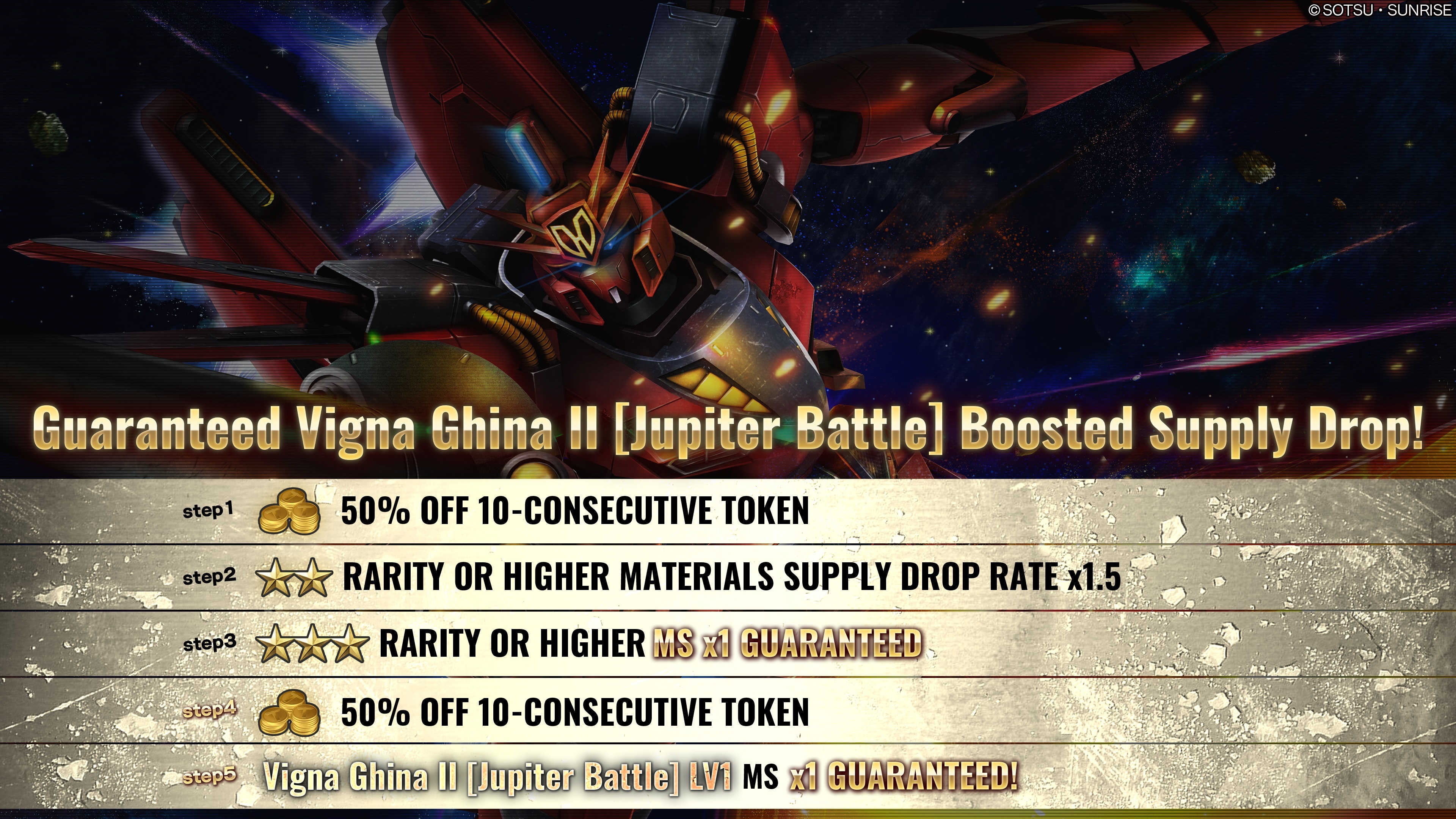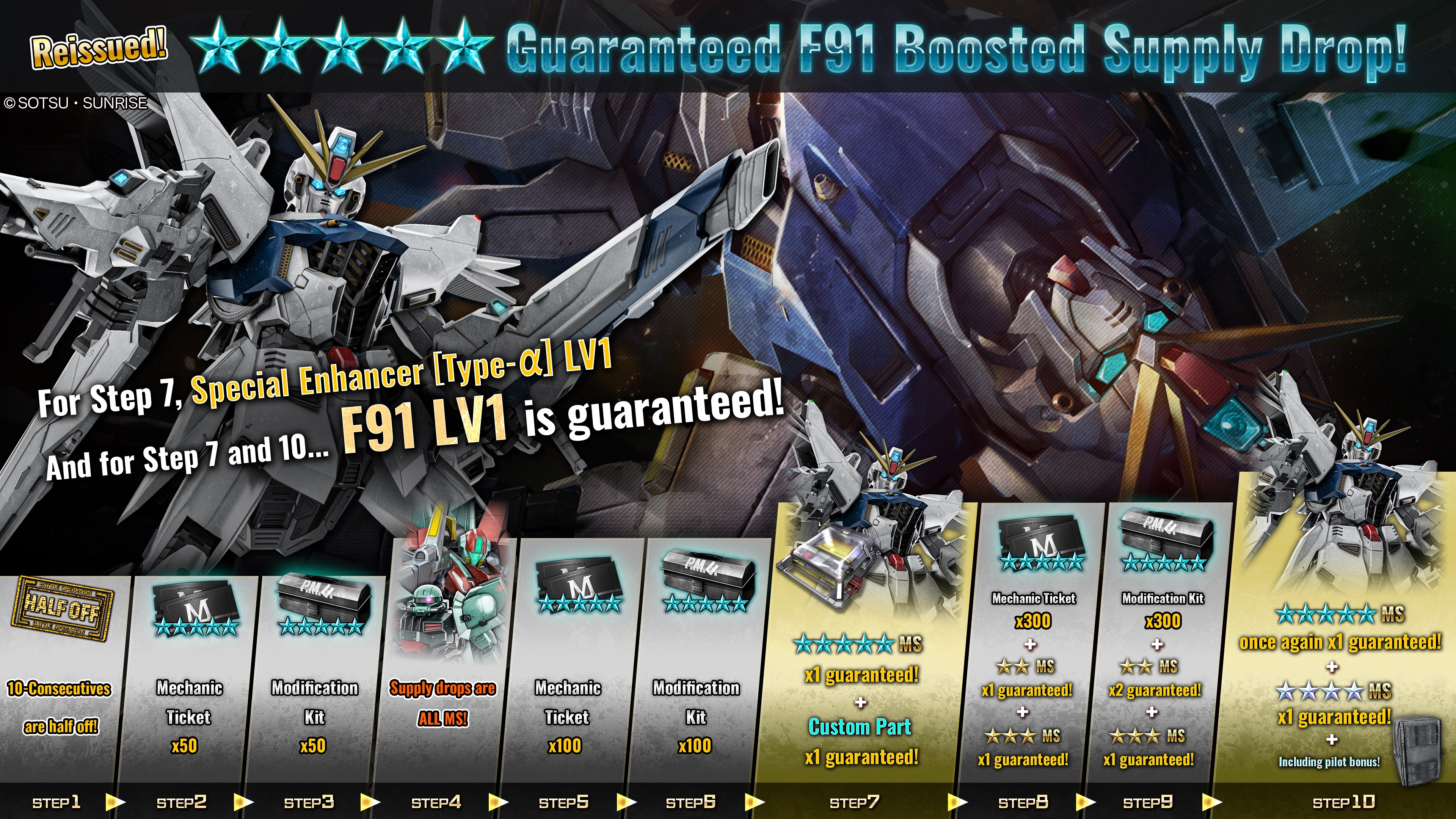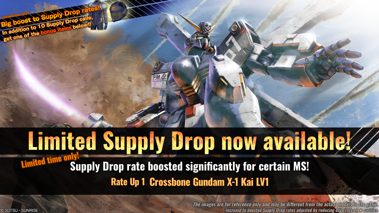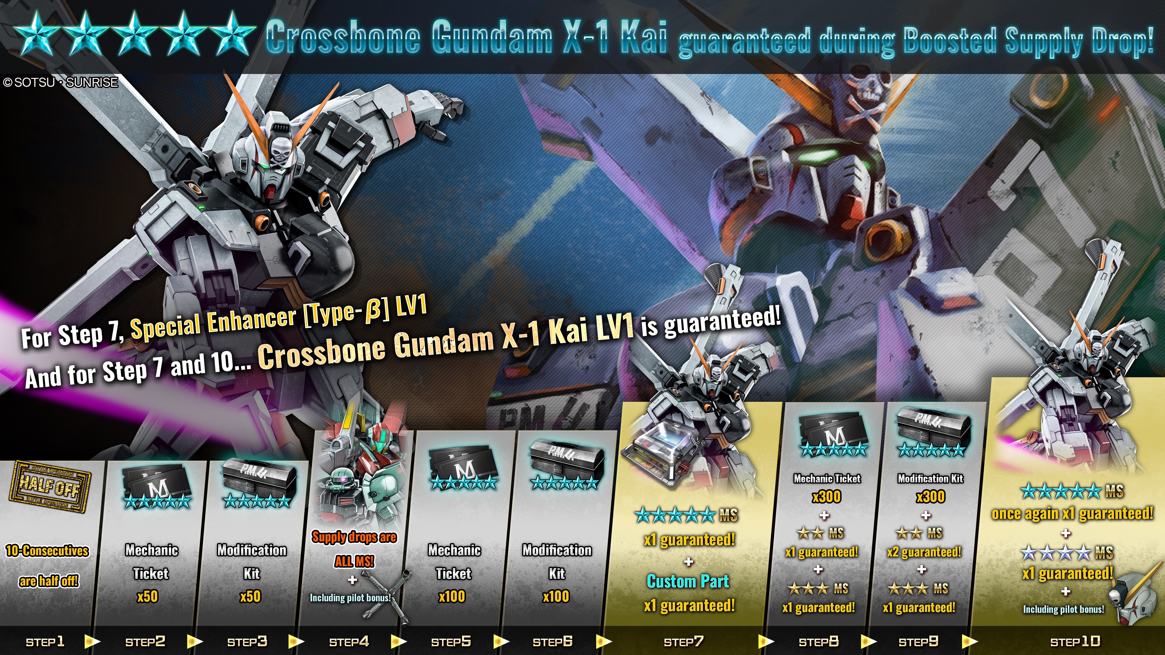 ■Content A Supply Drop, in which 10-consecutive Supply Drops can be requested up to STEP10. The STEP will progress by 1 each time you perform a request, as STEP1 → STEP2 → STEP3 → STEP4 → STEP5 → STEP6 → STEP7 → STEP8 → STEP9 → STEP10. After STEP10 is requested, Boosted Supply Drop will be over. ・STEP1 (15 Tokens): Tokens 50% OFF! ・STEP2 (30 Tokens): 50 ★★★★★ Mechanic Tickets for bonus! ・STEP3 (30 Tokens): 50 ★★★★★ Modification Kit for bonus! ・STEP4 (30 Tokens): ALL Drops will be MS! + accessory “Backpack: X-1 Kai” for bonus! ・STEP5 (30 Tokens): 100 ★★★★★ Mechanic Tickets for bonus! ・STEP6 (30 Tokens): 100 ★★★★★ Modification Kit for bonus! ・STEP7 (30 Tokens): “Crossbone Gundam X-1 Kai LV1” x1 guaranteed!! + Custom part “Special Enhancer [Type-β] LV1” for bonus! ・STEP8 (30 Tokens): ★★ MS x1 & ★★★ MS x1 guaranteed! + 300 ★★★★★ Mechanic Tickets for bonus! ・STEP9 (30 Tokens): ★★ MS x2 & ★★★ MS x1 guaranteed! + 300 ★★★★★ Modification Kit for bonus! ・STEP10 (30 Tokens): Another “Crossbone Gundam X-1 Kai LV1” guaranteed!! + ★★★★ MS x1 guaranteed! + Accessory “Mask: X-1 Kai” for bonus!