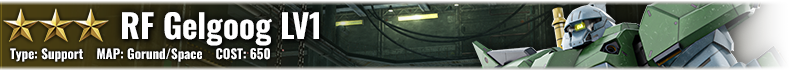 Spec ・Unit HP is enhanced as “18000” → “20000”(Upper LVs are also enhanced) ・High-speed movement is enhanced as “165” → “190” ・Thrusters are enhanced as “60” → “65” ⇒LV3 and above unit thrusters are enhanced as “60” → “70” ・Rotate is enhanced as “57” → “60” ・Close range part slot is increased as “5” → “7”(Upper LVs are also enhanced) ・Mid-range part slot is increased as “10” → “11”(Upper LVs are also enhanced) ・Long range part slot is increased as “17” → “18”(Upper LVs are also enhanced) ・Unit skill “High-Performance Balancer LV1” has been given ・Unit skill “Damage Control LV1” has been given ⇒LV4 and above unit skill “Damage Control LV2” has been given ・Unit skill “Special Leg Buffer LV1” is adjusted to “LV3” ⇒LV3–4 Unit skill “Special Leg Buffer LV2” is adjusted to “LV4” ⇒LV5 Unit skill “Special Leg Buffer LV2” is adjusted to “LV5” ・Unit skill “Enhanced Tackle LV1” is adjusted to “LV3” ⇒LV2 and above unit skill “Enhanced Tackle LV1” is adjusted to “LV4” Ranged main weapon: Gelgoog Cannon BR ・New added Sub-weapon: Shoulder Beam Cannon ・Power is increased as “3000” → “3200”(Upper LVs are also enhanced) ・Weapon switching time is shortened Sub-weapon: Arm 3-Tube Missile Launcher ・Power is increased as “375” → “400”(Upper LVs are also enhanced) ・Stagger accumulation value is enhanced