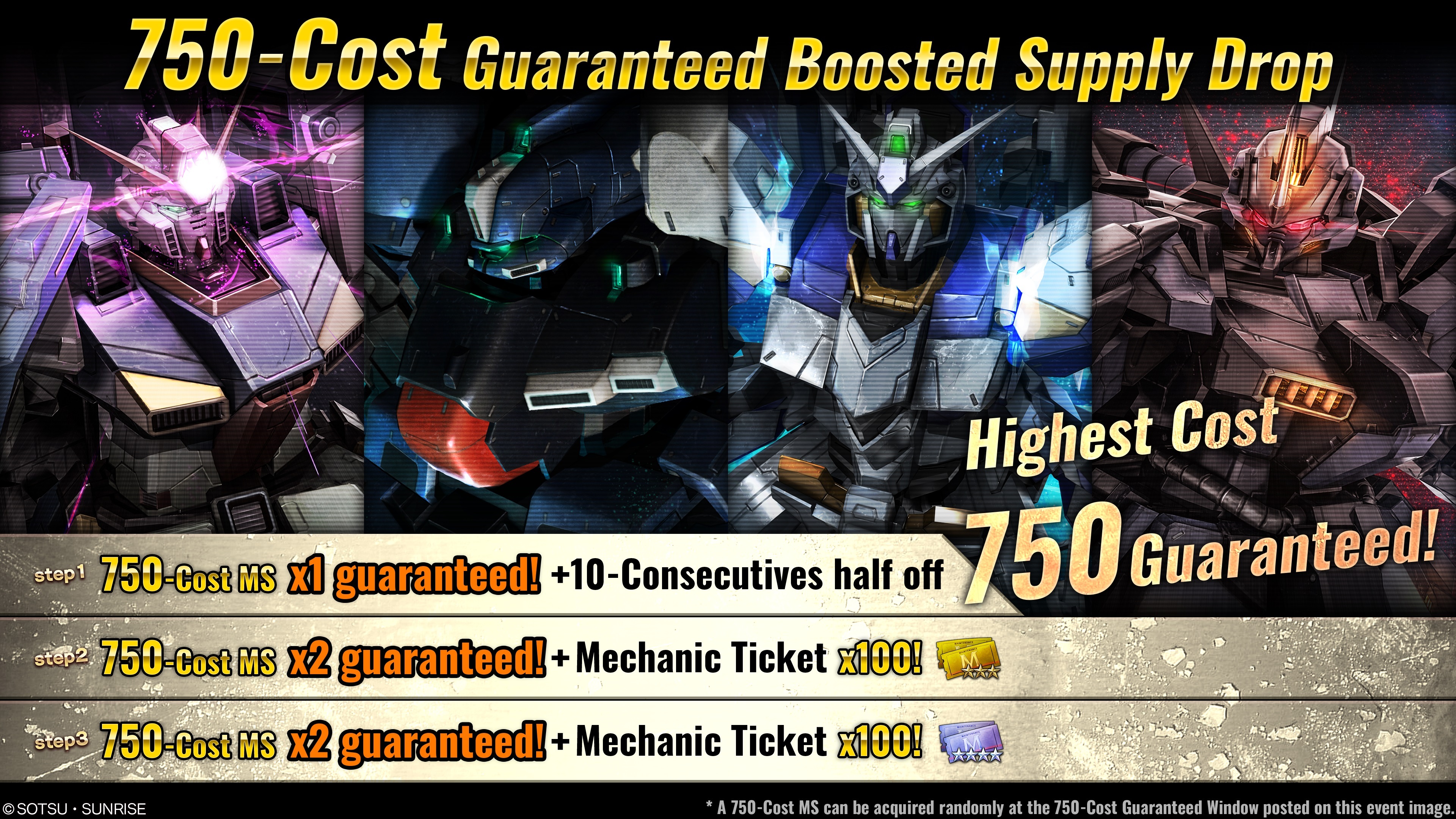 ■Content A Supply Drop, in which 10 consecutive Supply Drops can be requested up to STEP3. The STEP will progress by 1 each time you perform a request, as STEP1 → STEP2 → STEP3. After STEP3 is requested, Boosted Supply Drop will be over. ・STEP1 (15 tokens): 1 COST 750 MS guaranteed! + 50% token off! ・STEP2 (30 tokens): 2 COST 750 MS guaranteed! + 100 ★★★ Mechanic tickets for bonus! ・STEP3 (30 tokens): 2 COST 750 MS guaranteed! + 100 ★★★★ Mechanic tickets for bonus!